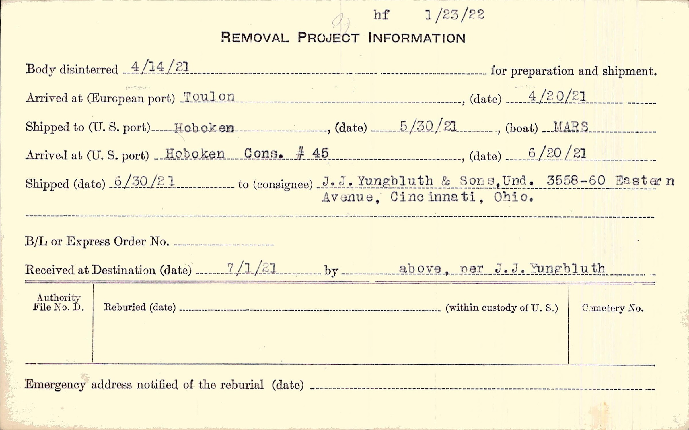 Body disinterred 4/14/1921 for preparation and shipment.