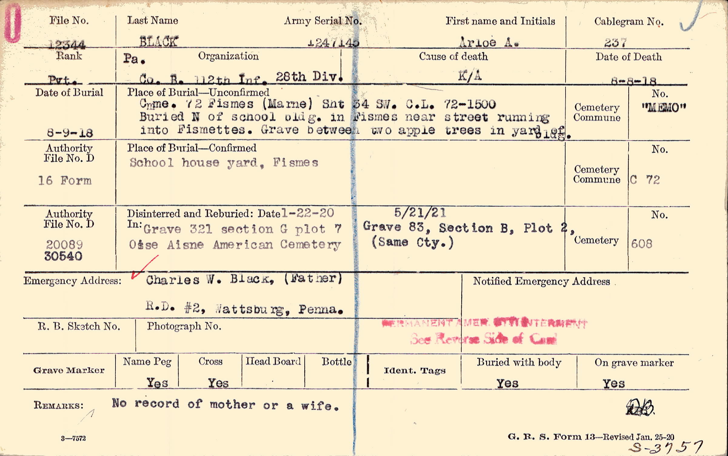 Cmme. 72 Fismes(Marne) Snt 34 SW. C.L. 72-1500 Buried N of School bldg. in Fismes near street running into Fismettes. Grave between two apple trees in yard of bldg.
