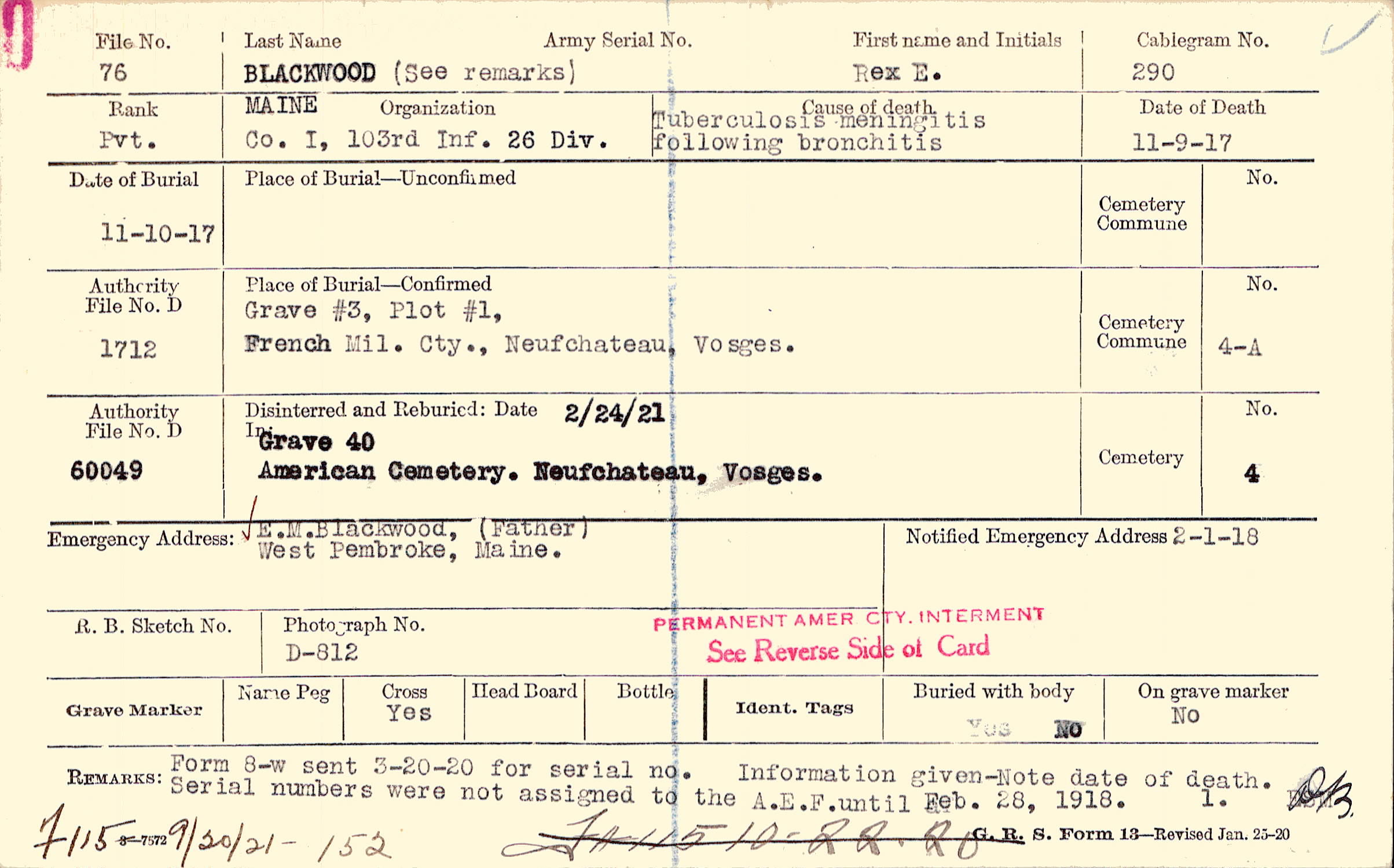 Form 8-w sent 3-20-20 for serial no. Information given -Note date of death.Serial numbers were not assigned to the A.E.F. until Feb. 28, 1918, [del]F#115 10-22-20[/del] F115 9/20/21 - 152
