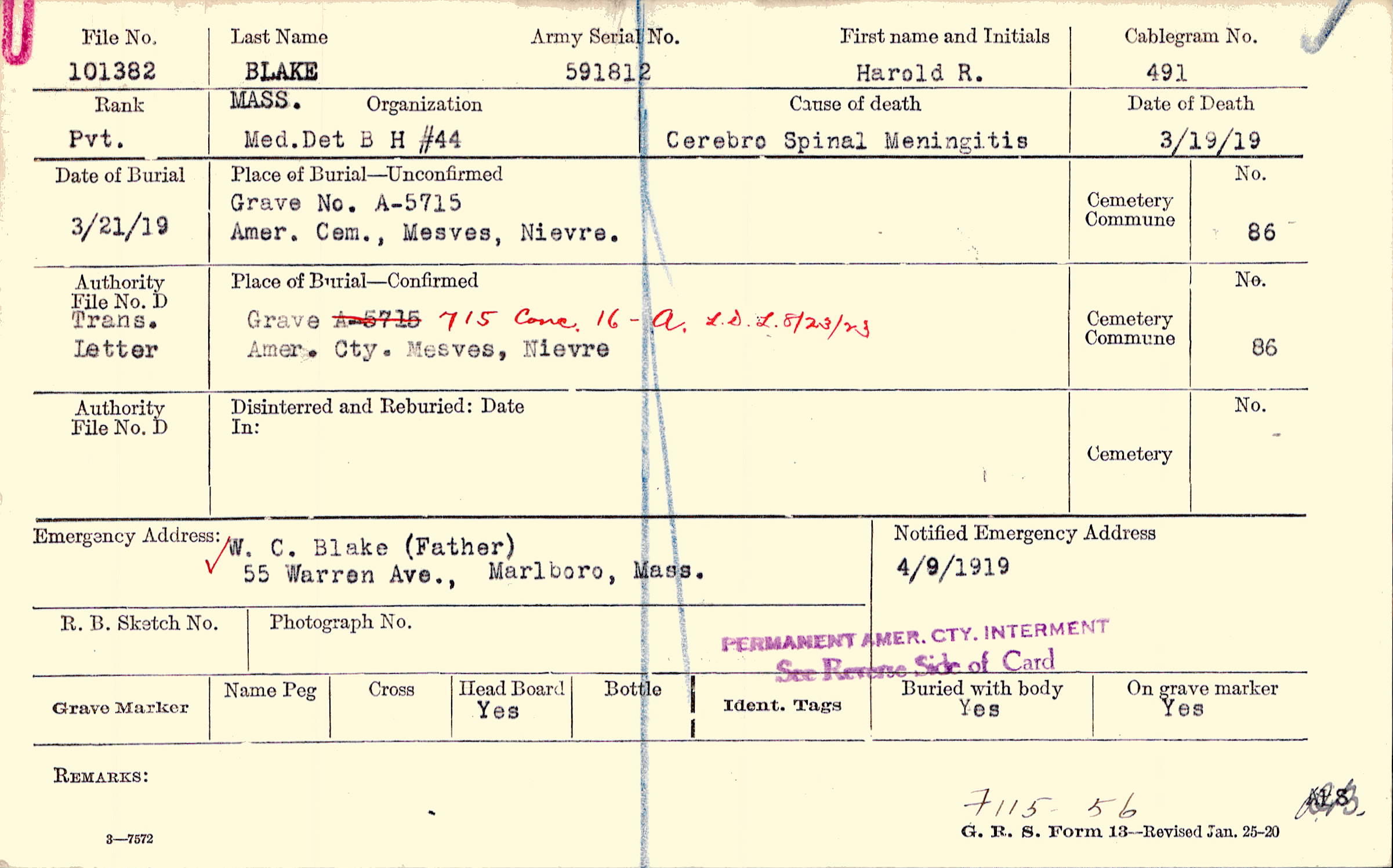 Grave No. A-5715, Amer. Cem., Mesves, Nievre.