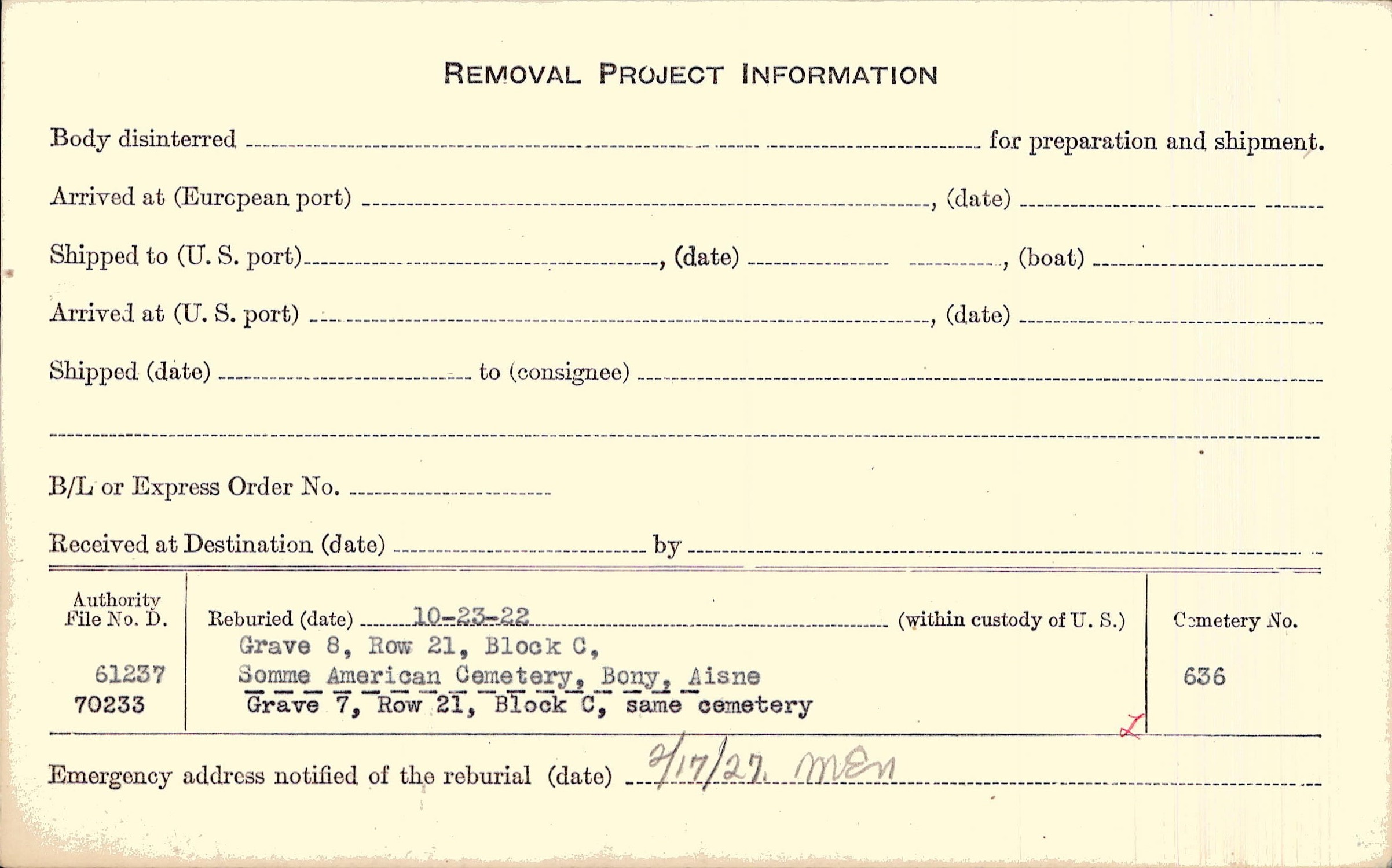 Prior Burial in Foreign Cemetery |
