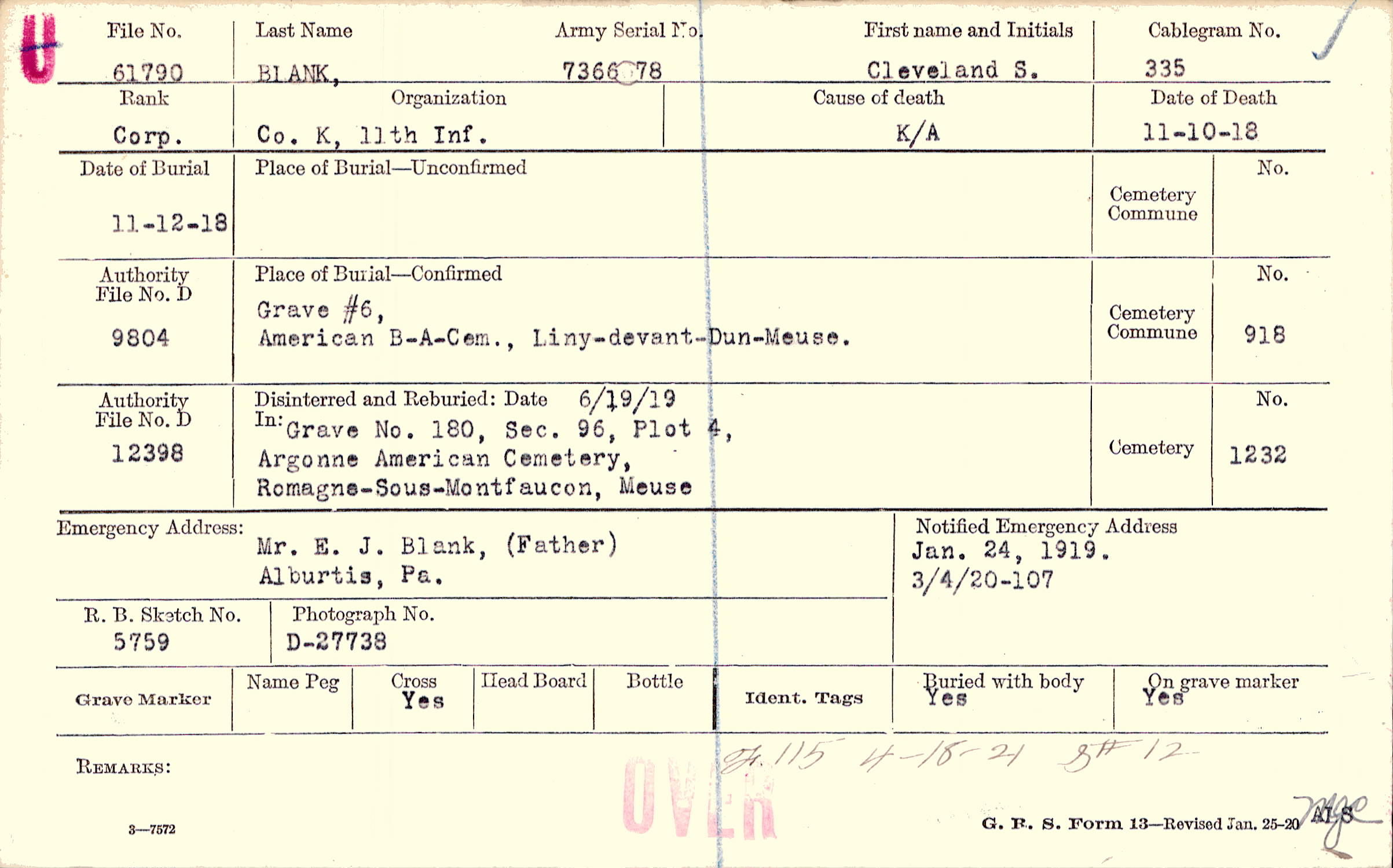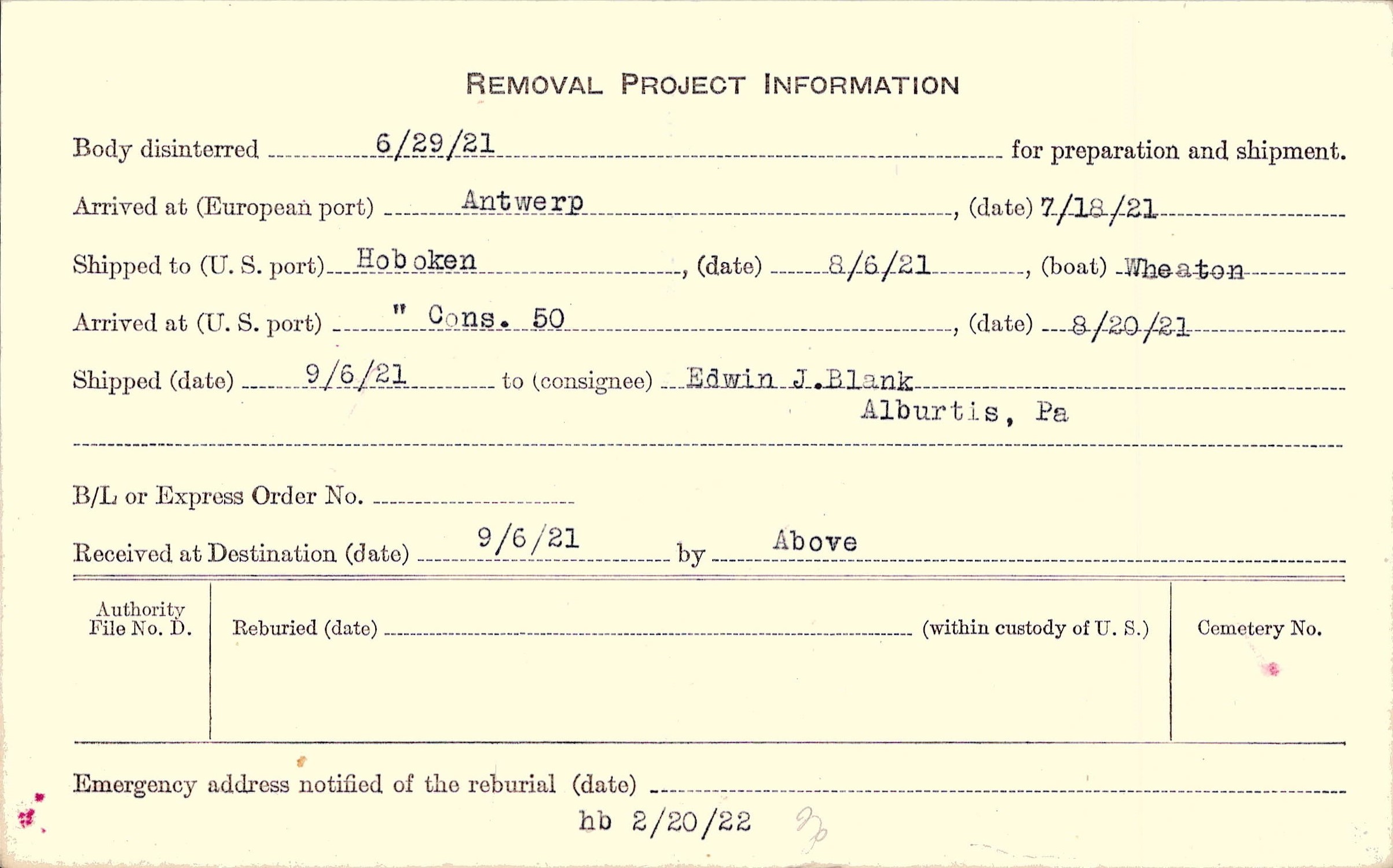 Body disinterred 6/29/1921 for preparation and shipment.