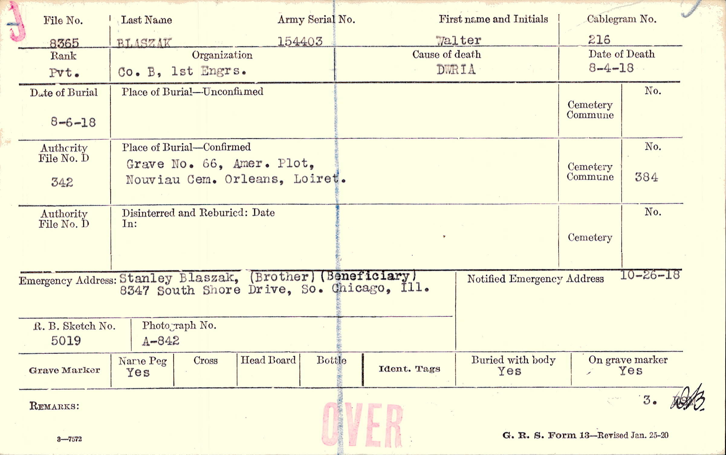 Stanley Blaszak, (Brother), 8347 South Shore Drive, So. Chicago, Ill., (Beneficiary)