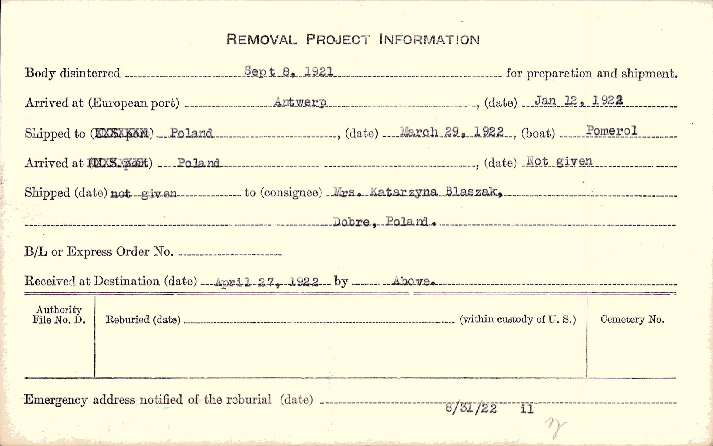 Body disinterred 9/8/1921 for preparation and shipment.