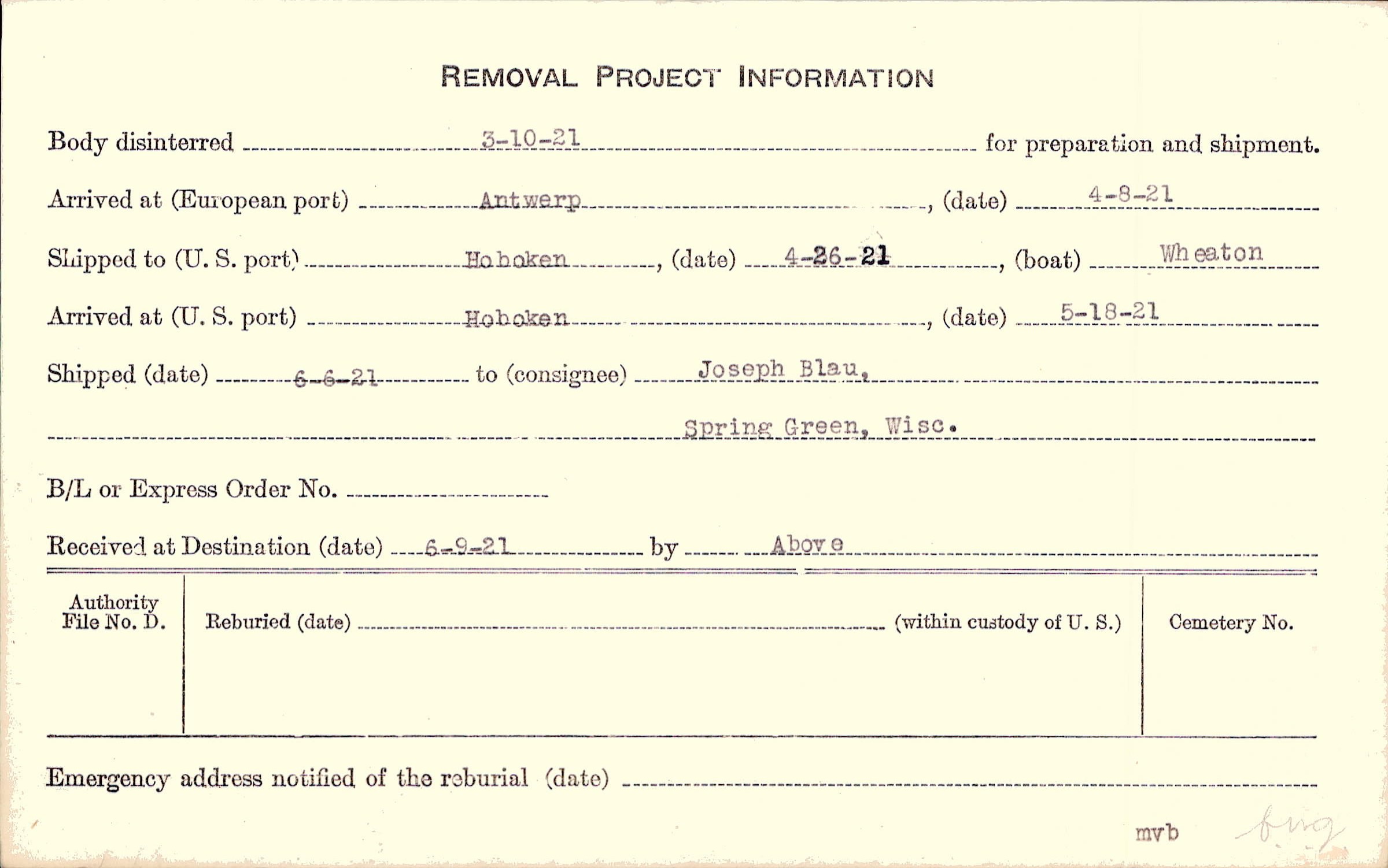 Body disinterred 3/10/1921 for preparation and shipment.