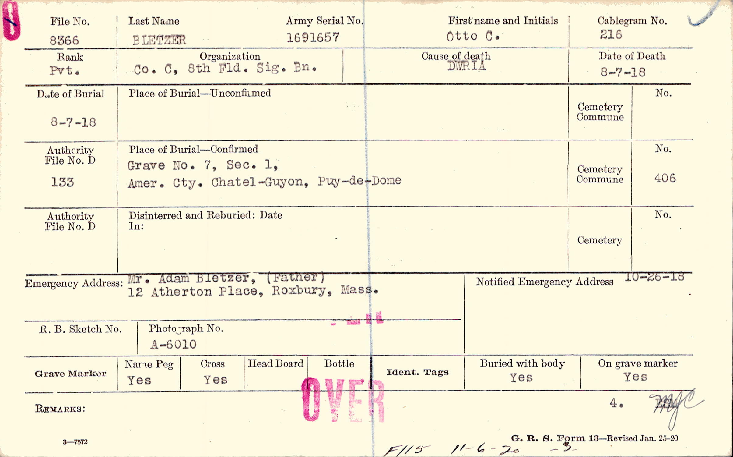 Mr. Adam Bletzer, (Father), 12 Atherton Place, Roxbury, Mass.