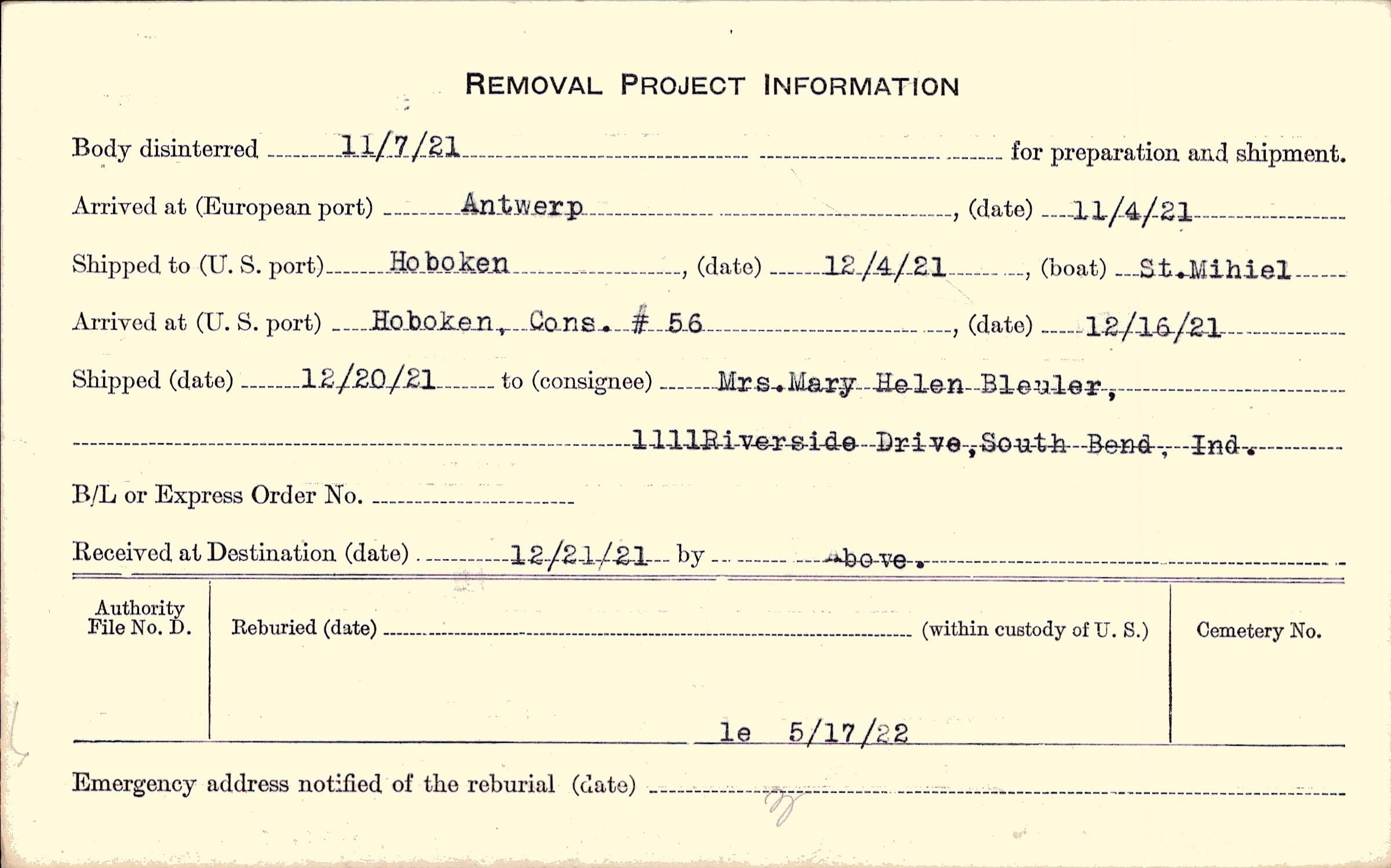 Body disinterred 11/7/1921 for preparation and shipment.