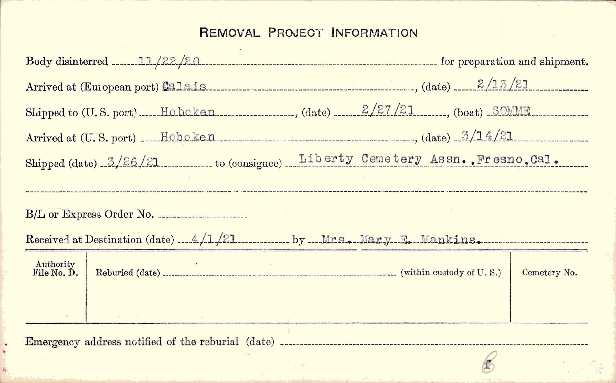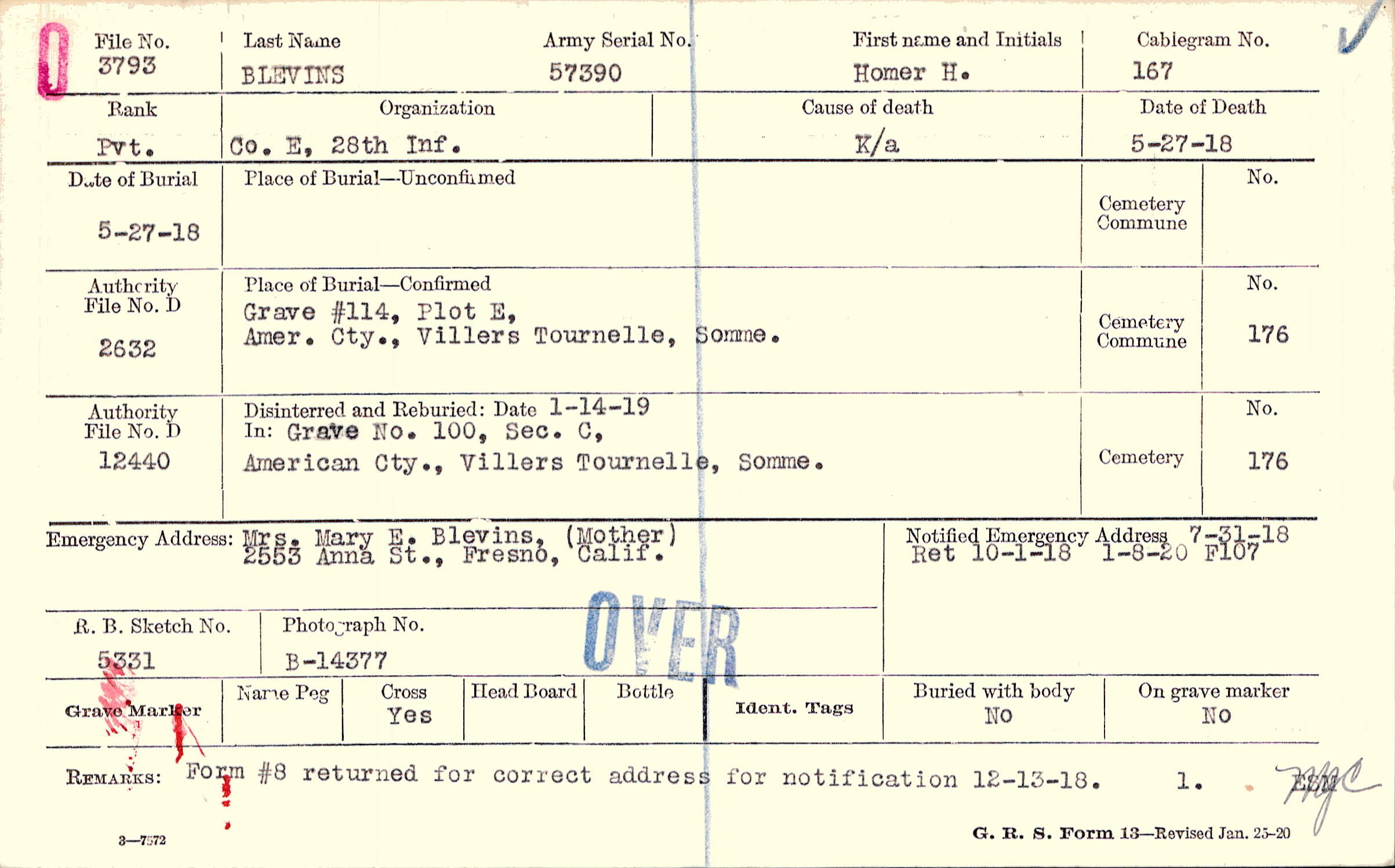 Mrs. Mary E. Blevins, (Mother), 2553 Anna St., Fresno, Calif.