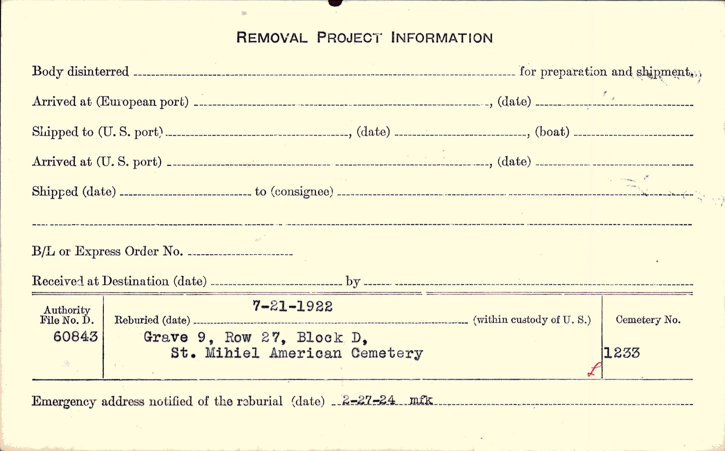 | Permanent Burial in Foreign Cemetery |