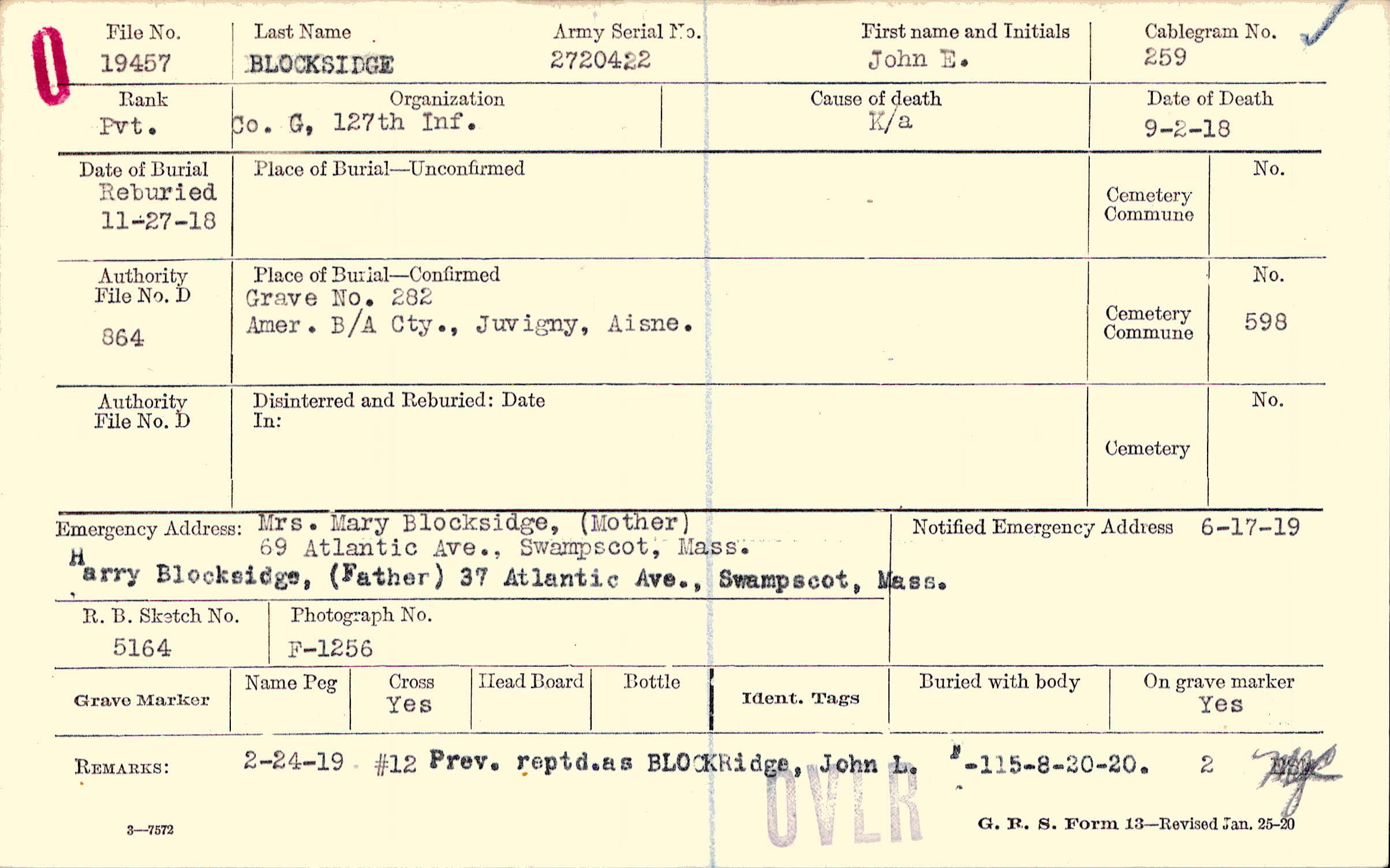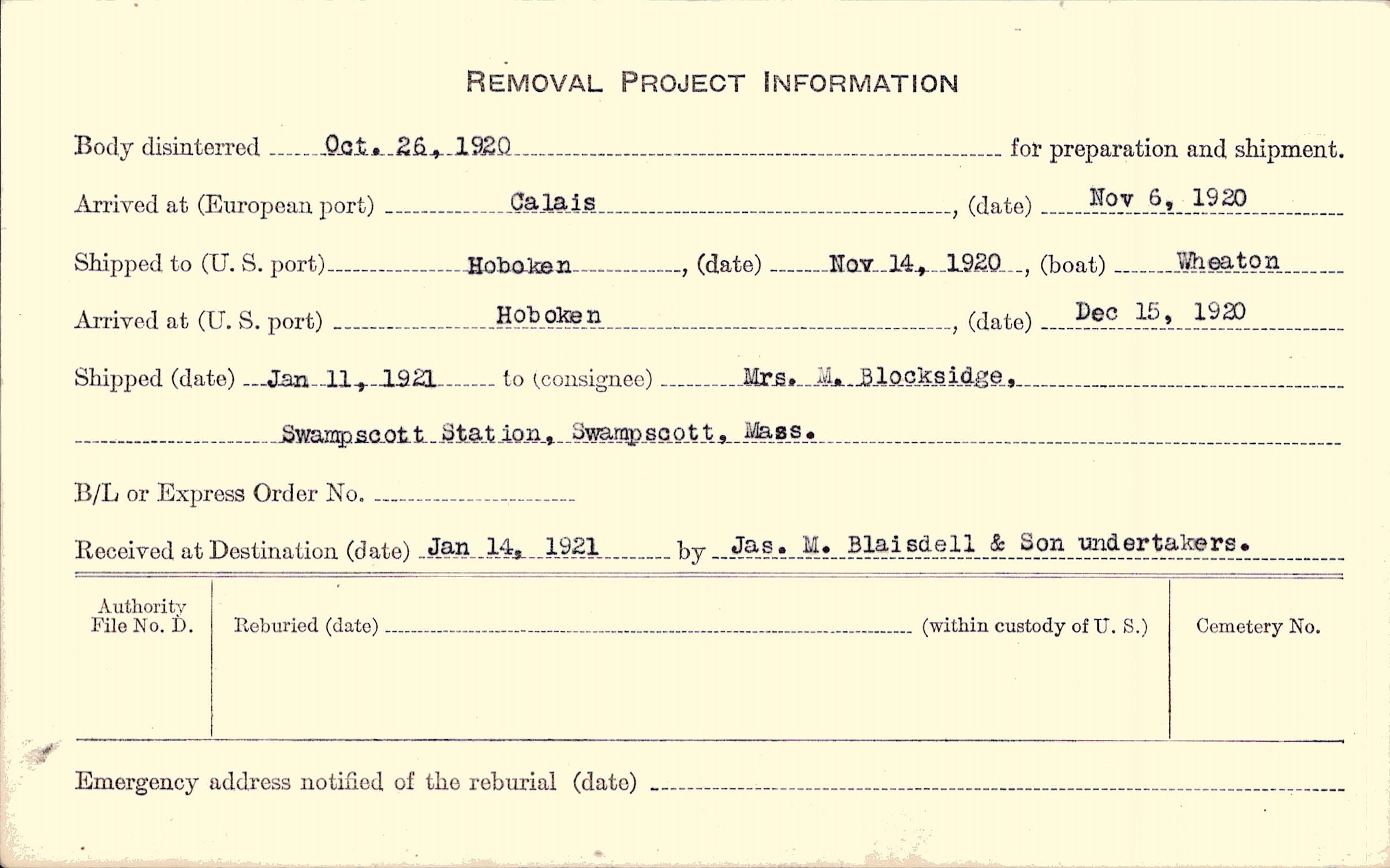Mrs. Mary Blocksidge, (Mother), 69 Atlantic Ave., Swampscot, Mass., Harry Blocksidge, (Father) 37 Atlantic Ave., Swampscot, Mass.