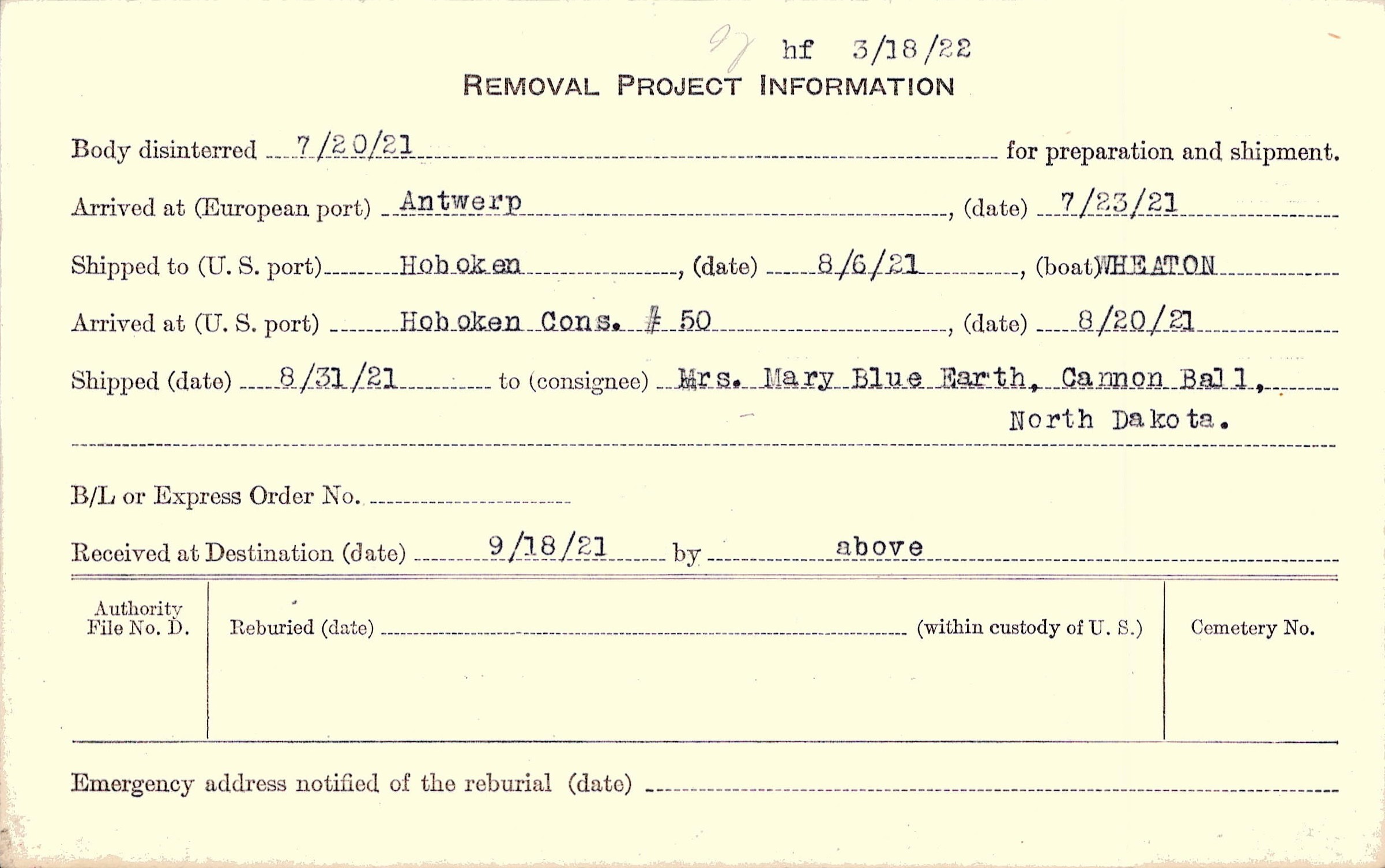 Body disinterred 7/20/1921 for preparation and shipment.