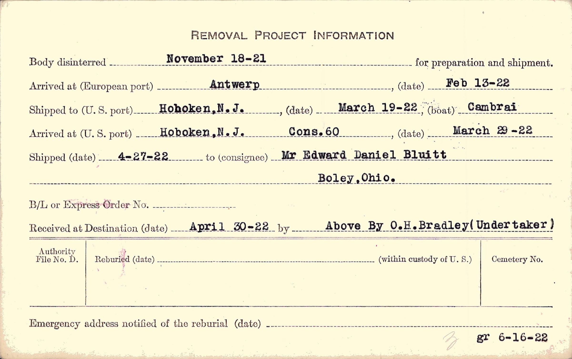Body disinterred 11/18/1921 for preparation and shipment.