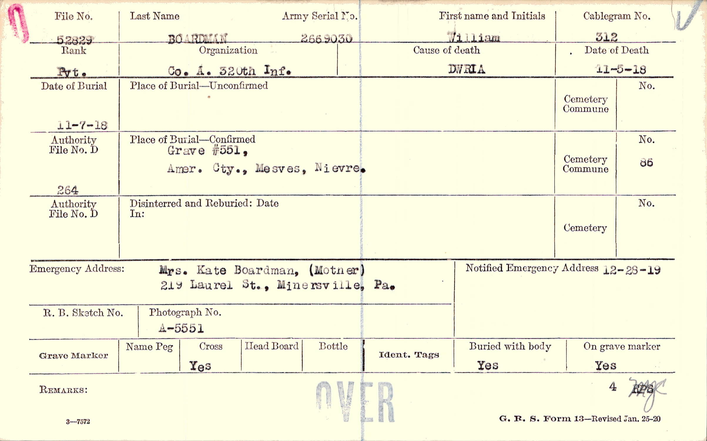 Mrs. Kate Boardman, (Mother), 219 Laurel St., Minersville, Pa.