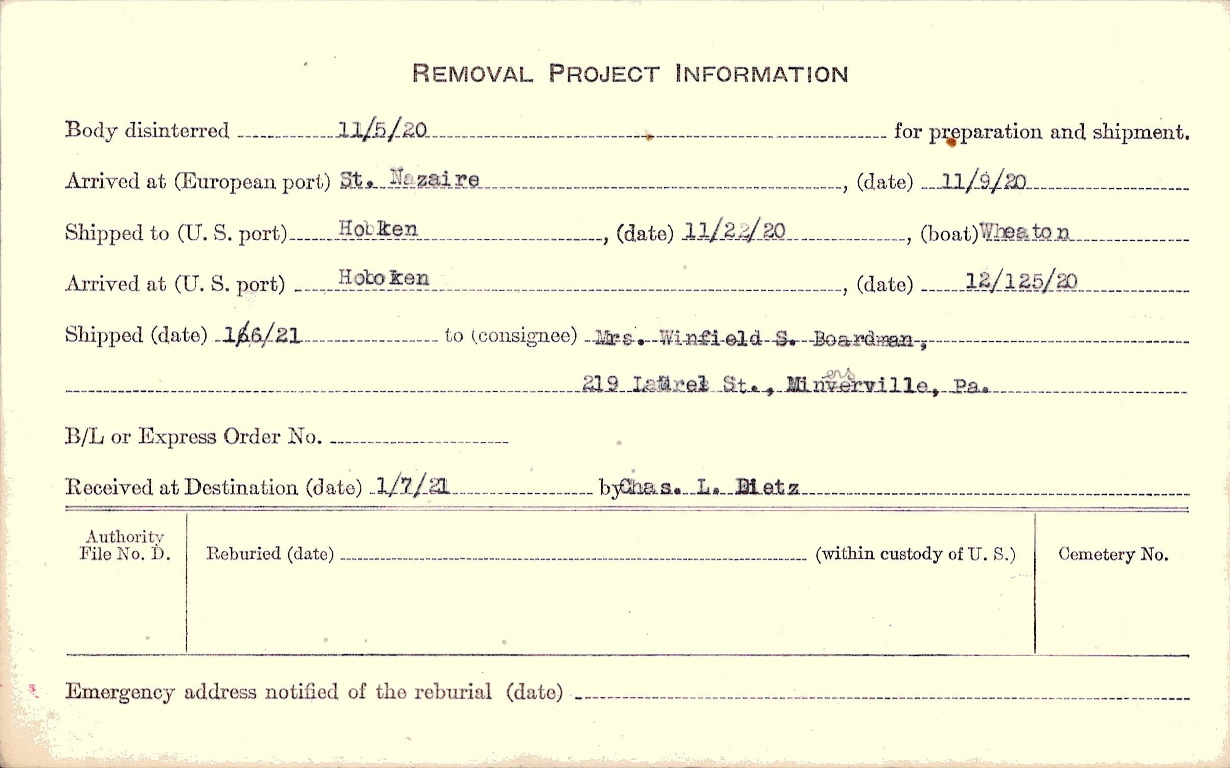 to Mrs. Winfield S. Boardman, 219 Laurel St., Minersville, Pa.