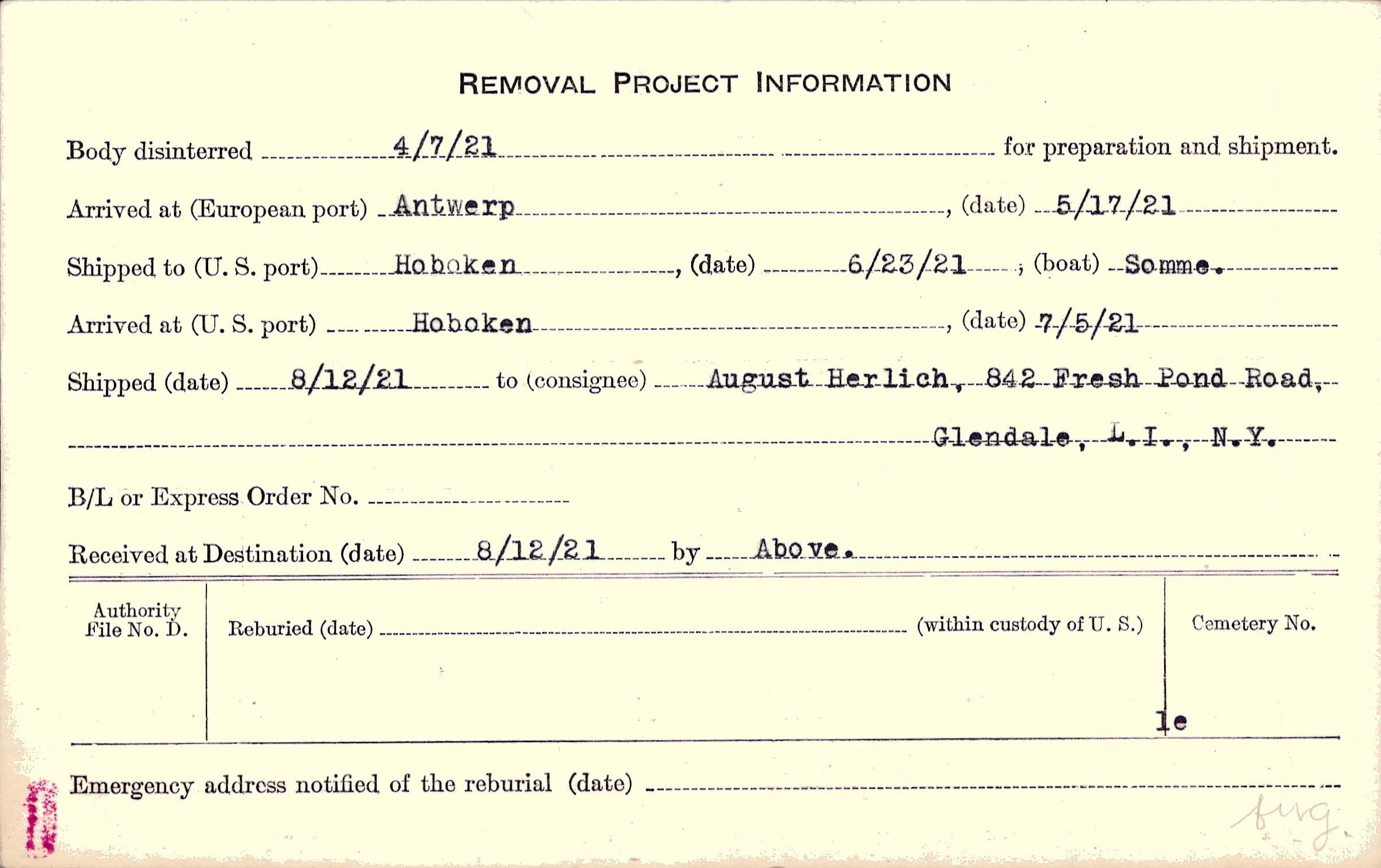Body disinterred 4/7/1921 for preparation and shipment.