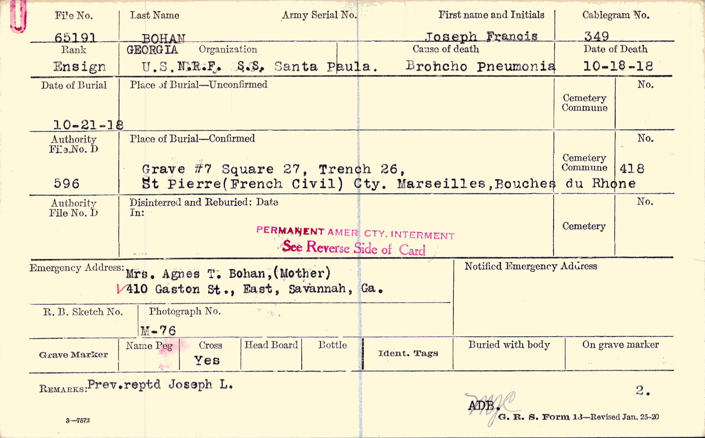 Mrs. Agnes T. Bohan, (Mother), 410 Gaston St., East, Savannah, Ga.