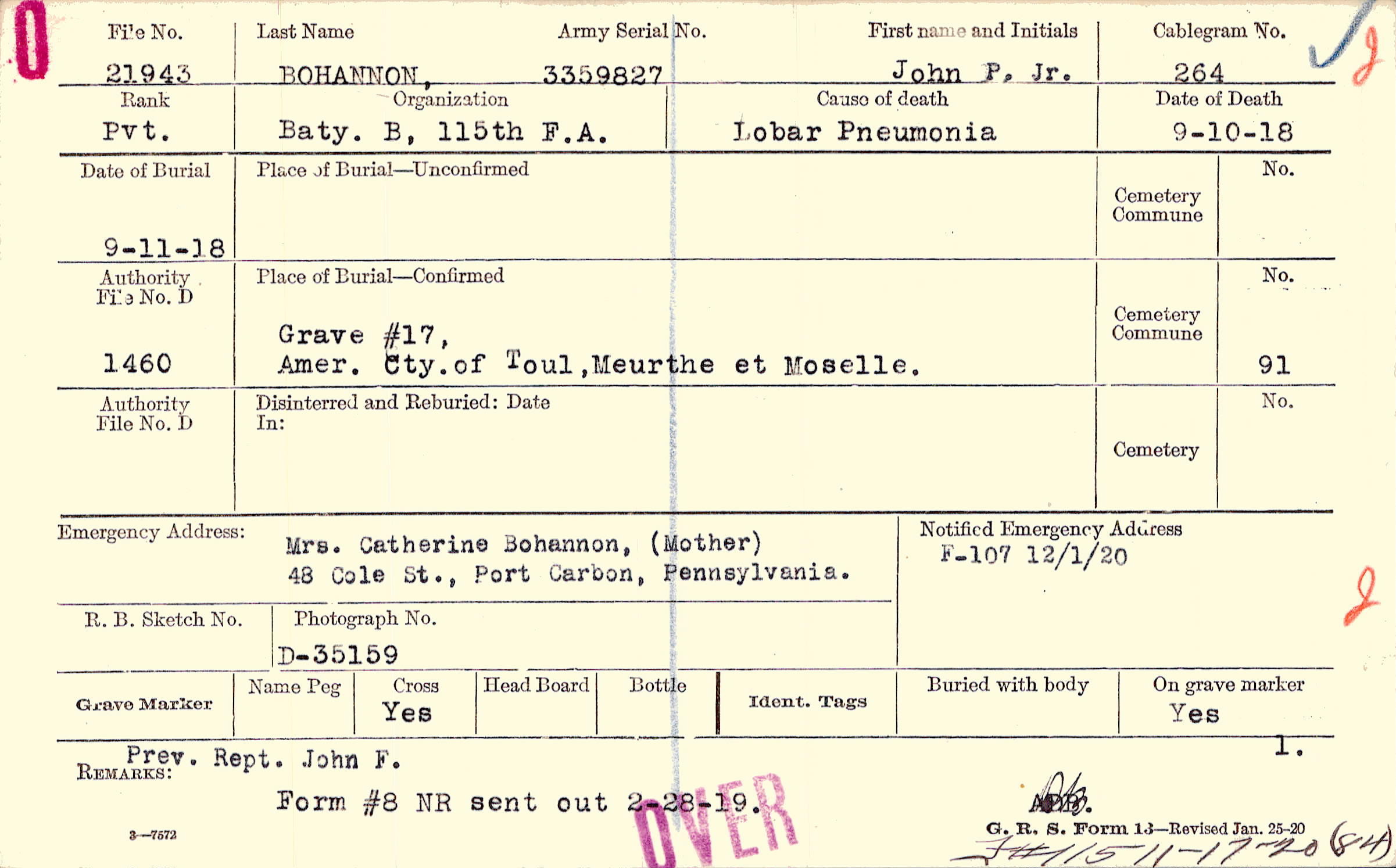 Mrs. Catherine Bohannon, (Mother), 48 Cole St., Port Carbon, Pennsylvania