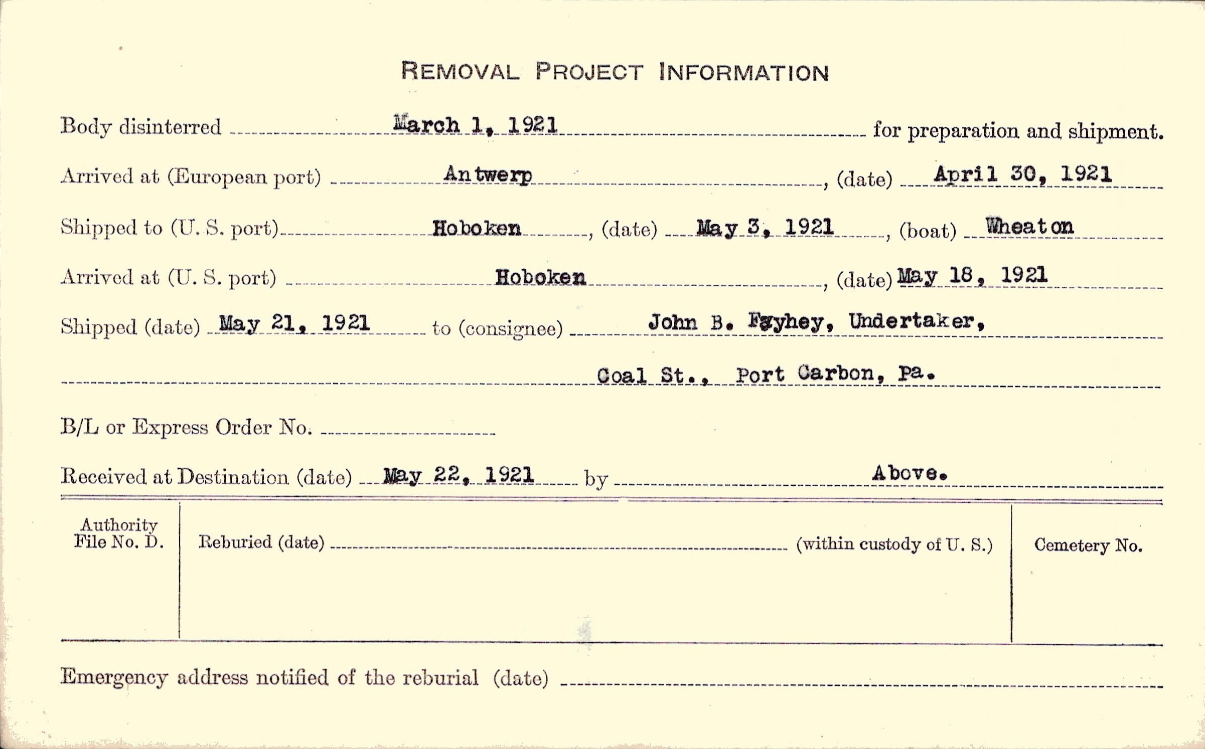 Body disinterred 3/1/1921 for preparation and shipment.