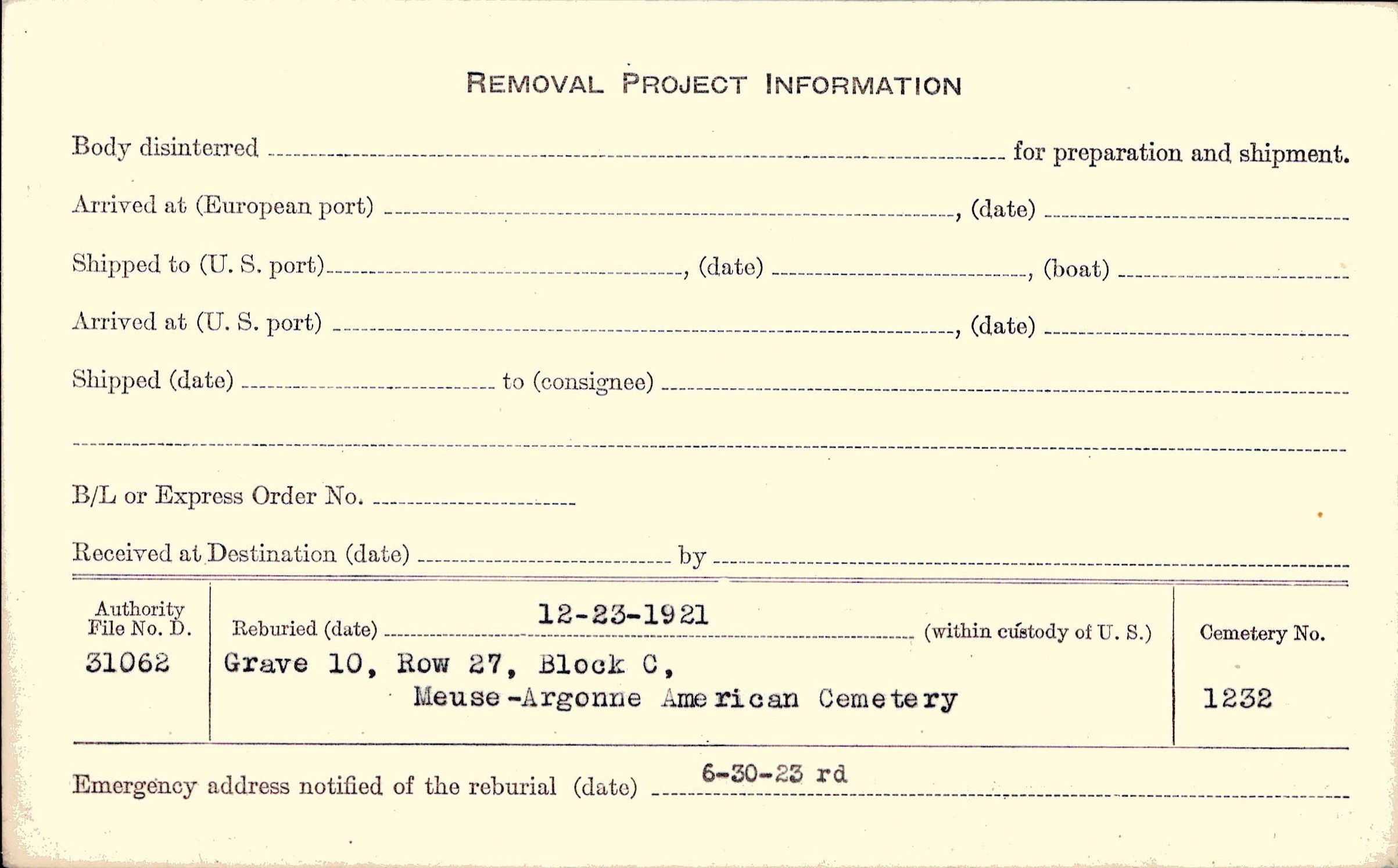 | Permanent Burial in Foreign Cemetery |