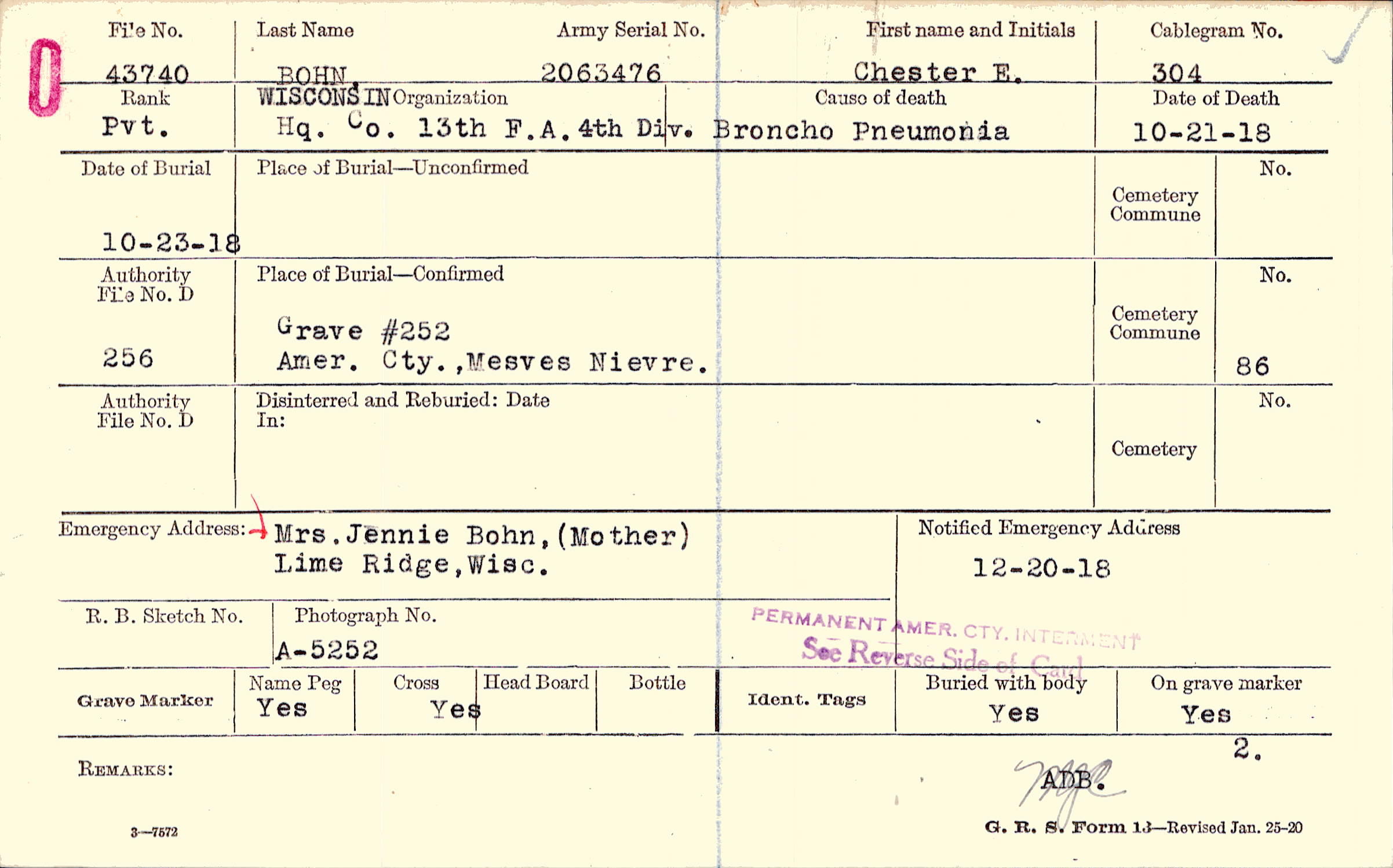 Grave #252, Amer. Cty., Mesves, Nievre.