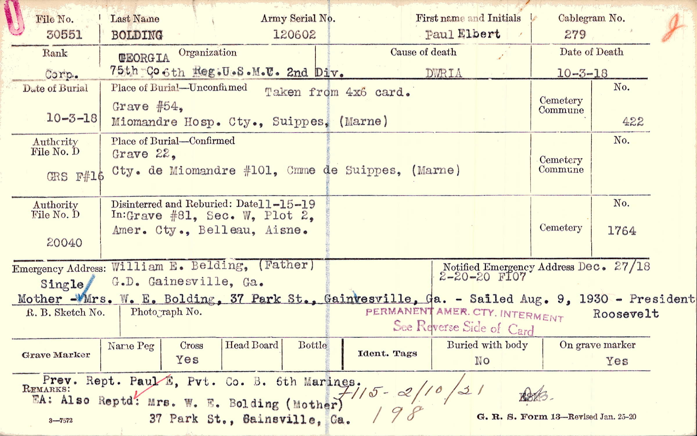 Prev. Rept. Paul E, Pvt. Co. B. 6th Marines. EA: Also Reptd: Mrs. W. E. Bolding (Mother) 37 Park St., Gainsville, Ga., F115 - 2/10/21 198