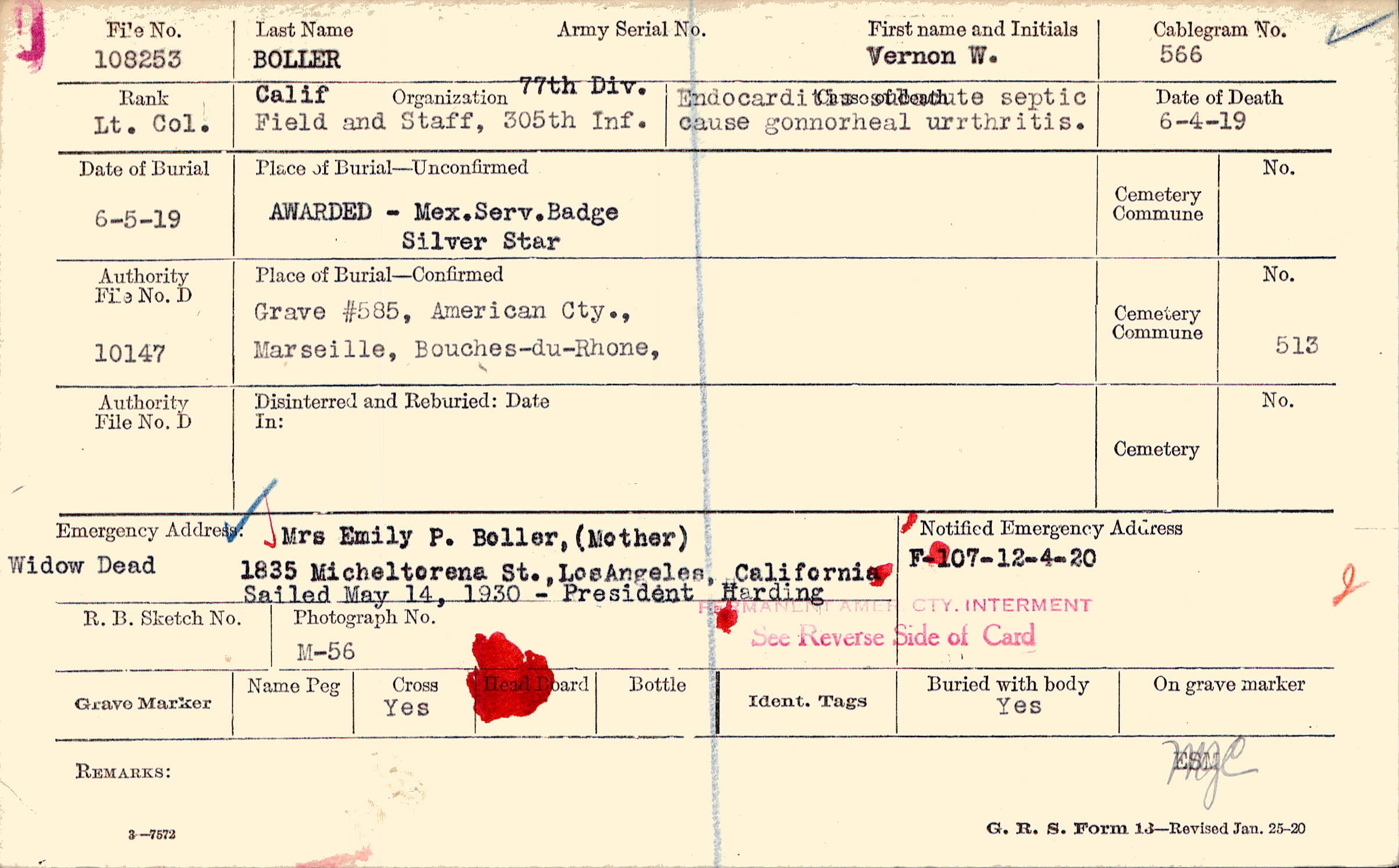 Mrs Emily P. Boller, (Mother), 1835 Micheltorena St., Los Angeles, California, Widow Dead Sailed May 14, 1930 - President Harding