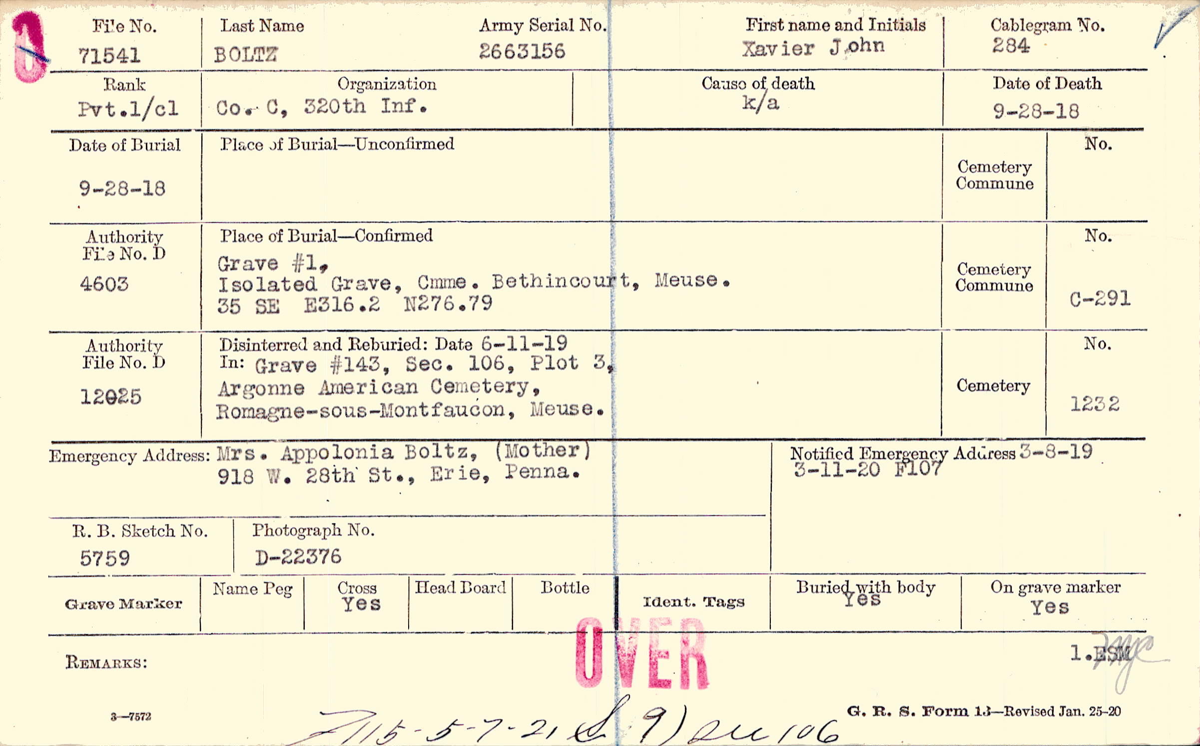 Mrs. Appolonia Boltz, (Mother), 918 W. 28th St., Erie, Penna.