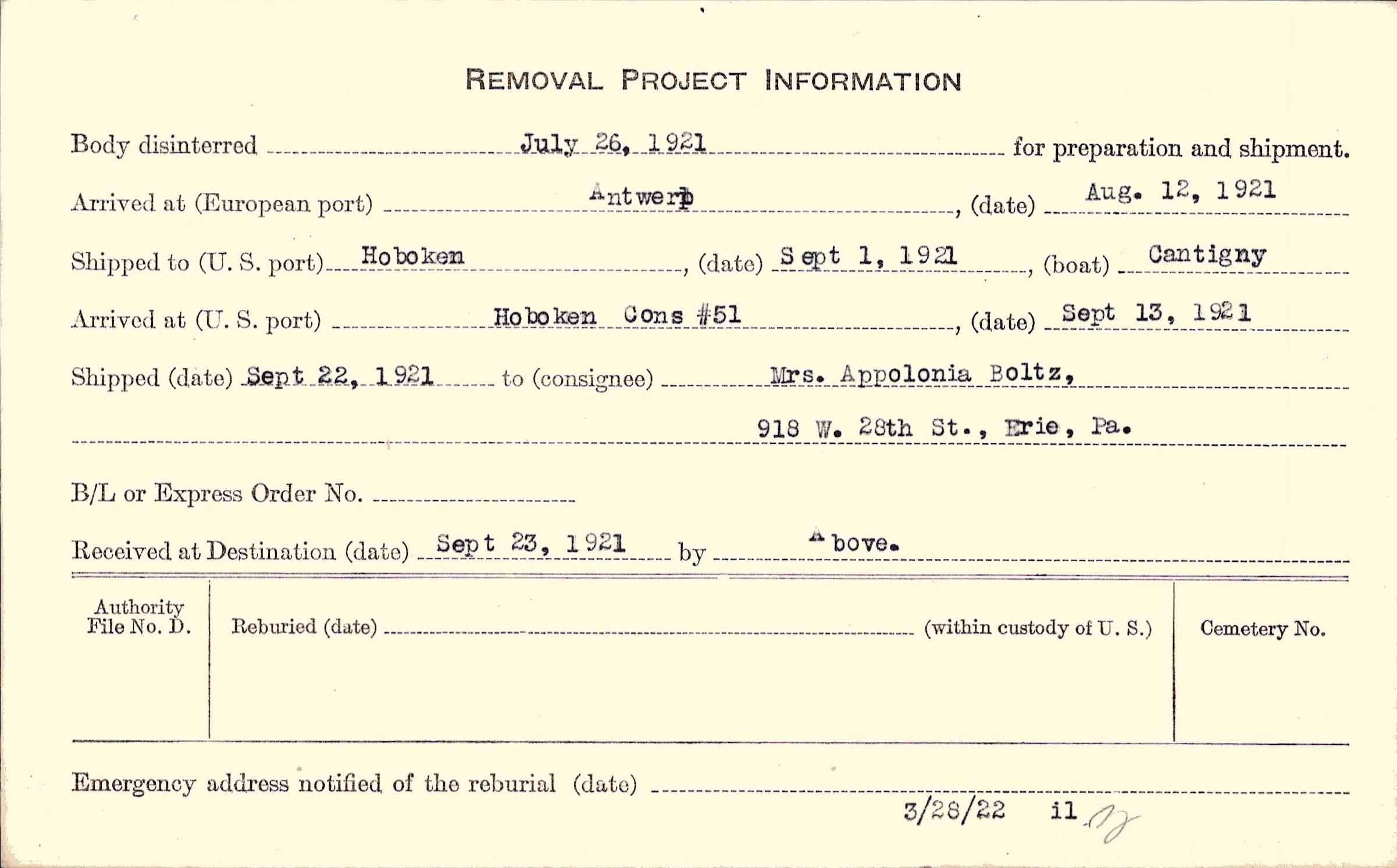 Body disinterred 7/26/1921 for preparation and shipment.