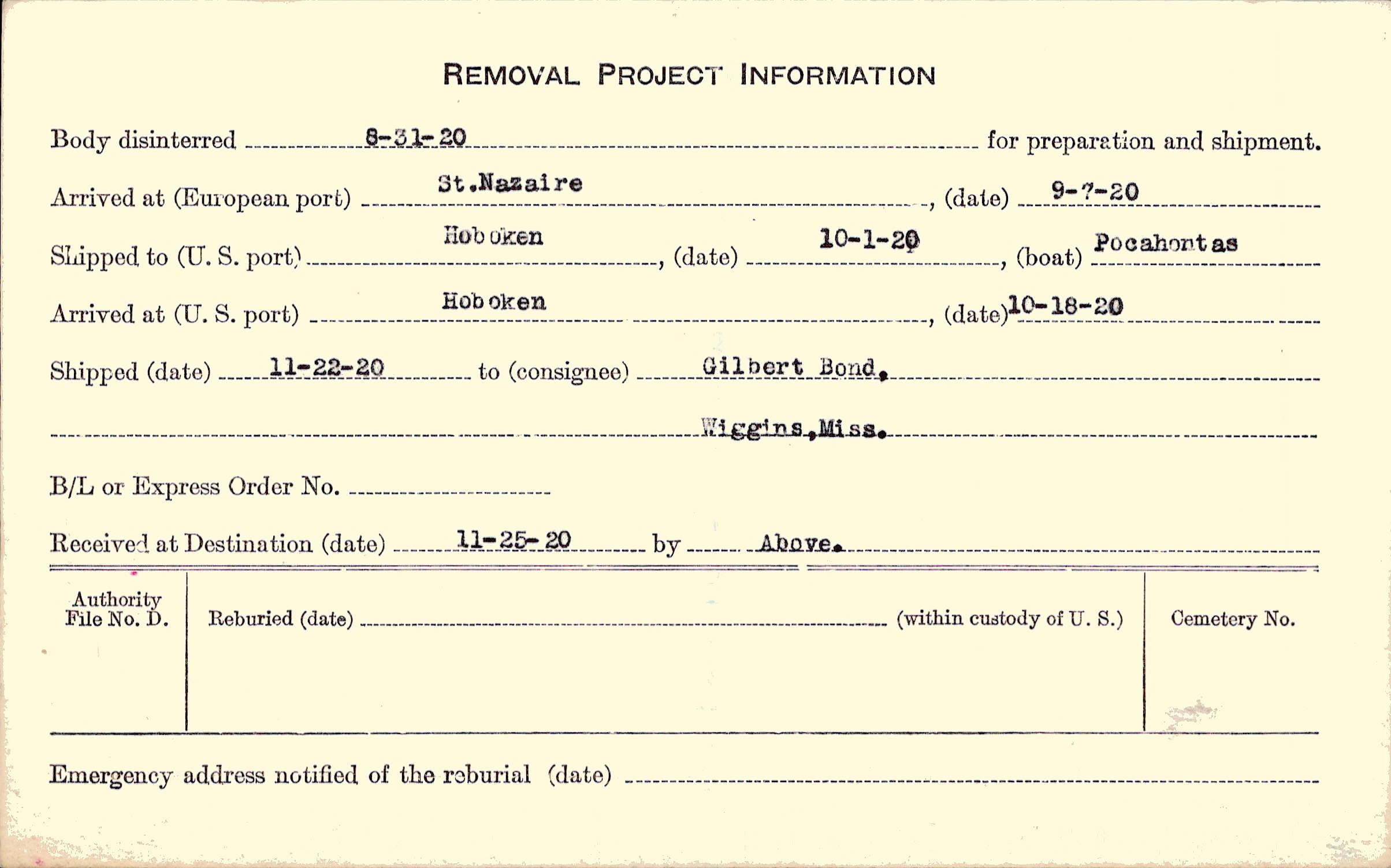 Body disinterred 8/31/1920 for preparation and shipment.
