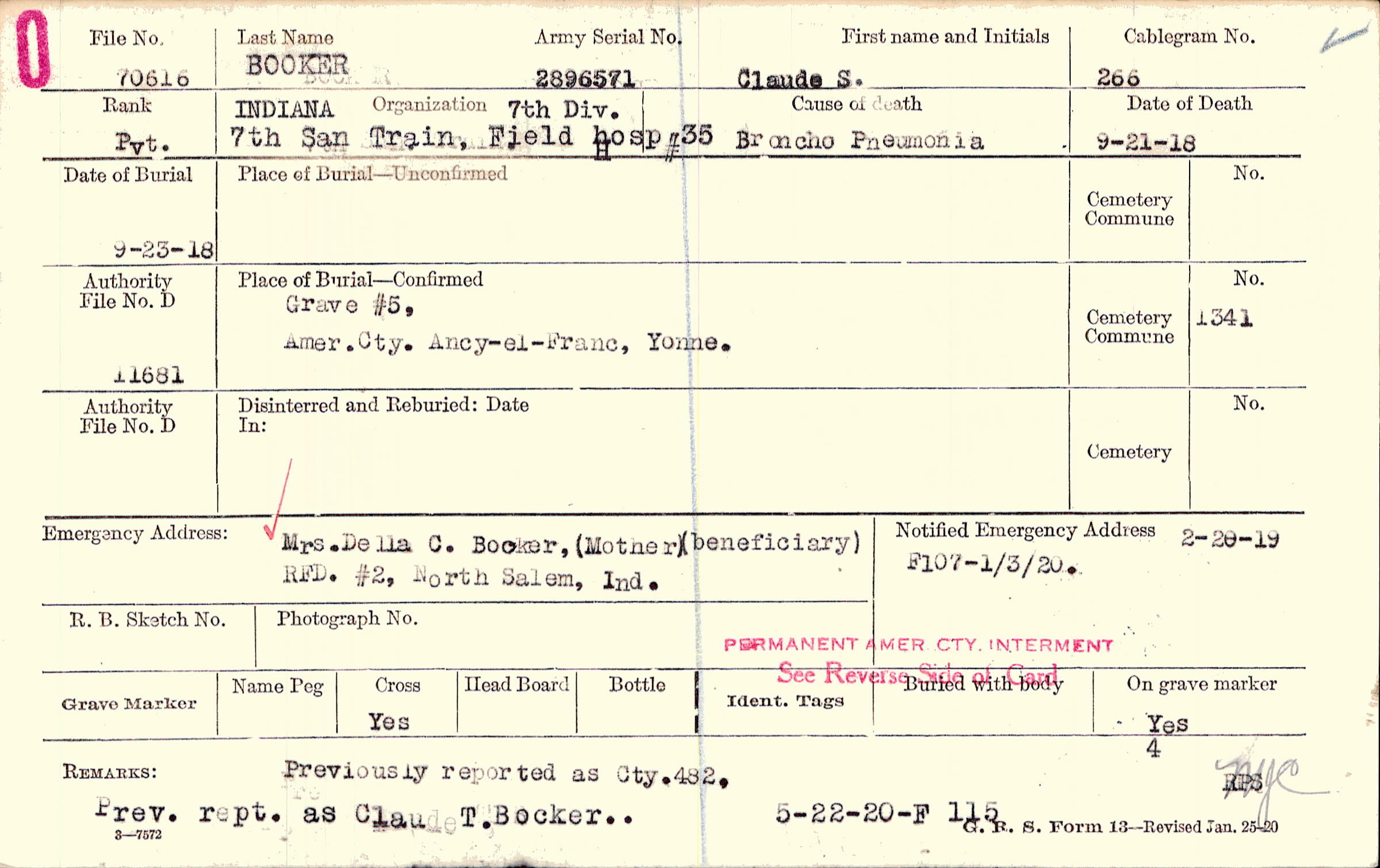 Mrs. Della C. Booker, (Mother), RFD. #2, North Salem, Ind., (beneficiary)