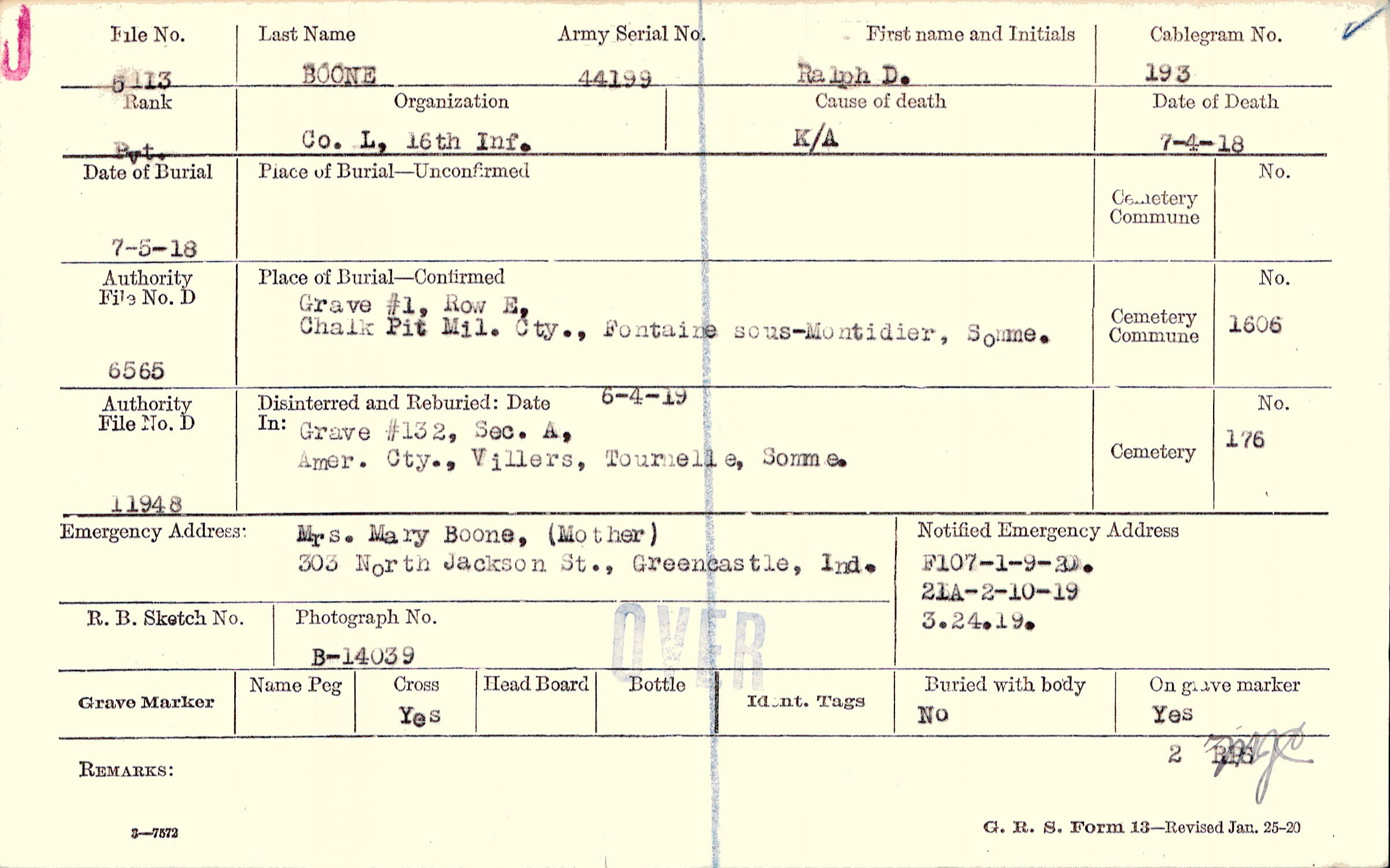 Grave #1, Row E, Chalk Pit Mil. Cty., Fontaine sous-Montidier, Somme.
