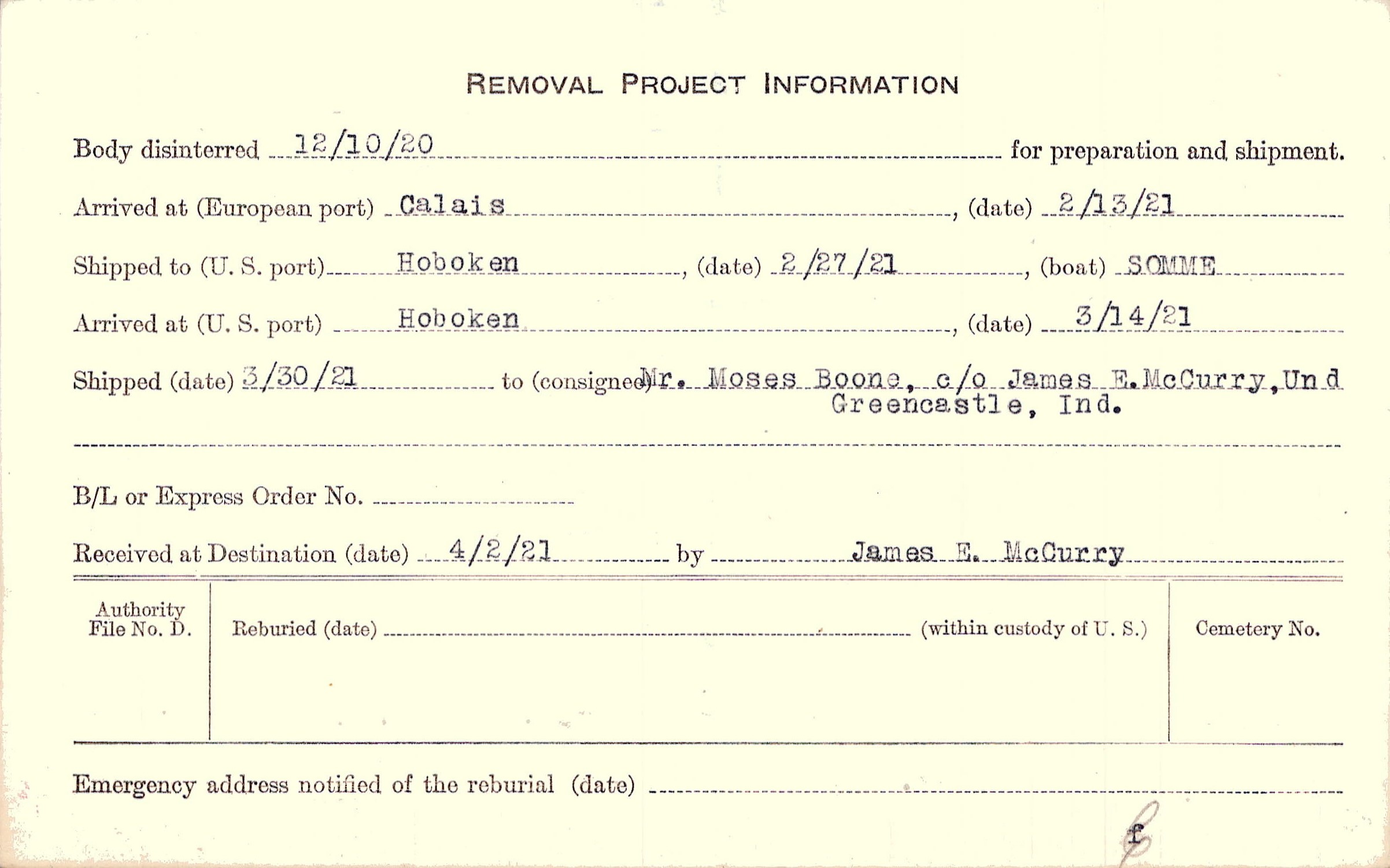 to Mr. Moses Boone, c/o James E. McCurry, Und Greencastle, Ind.