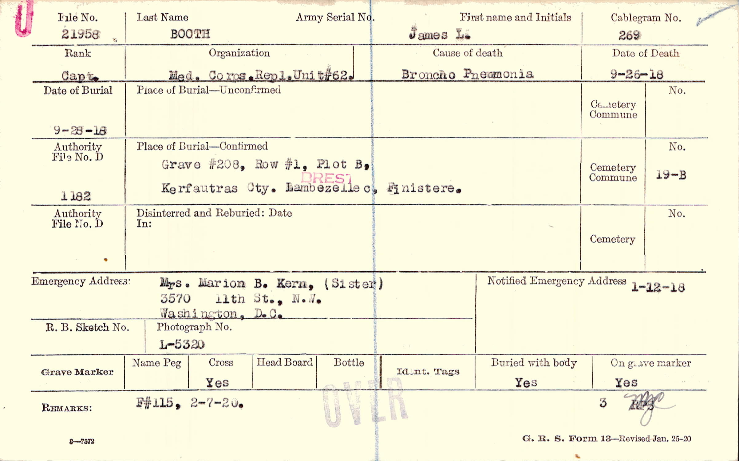 Grave #208, Row #1, Plot B,Kerfautras Cty., Lambezellec, Finistere.