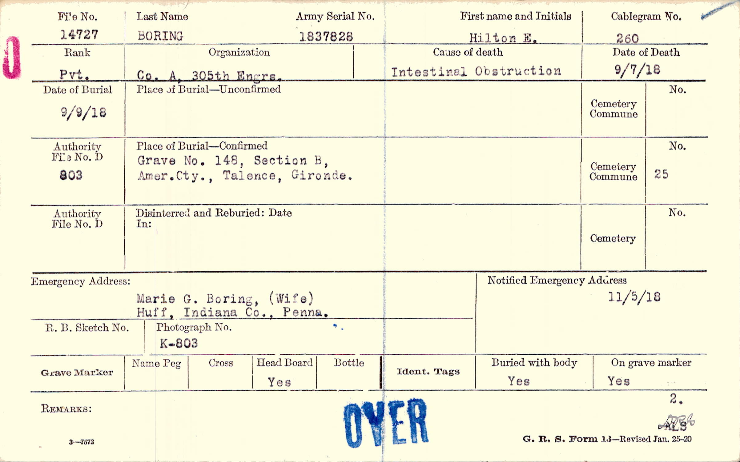 Marie G. Boring, (Wife), Huff, Indiana Co., Penna.