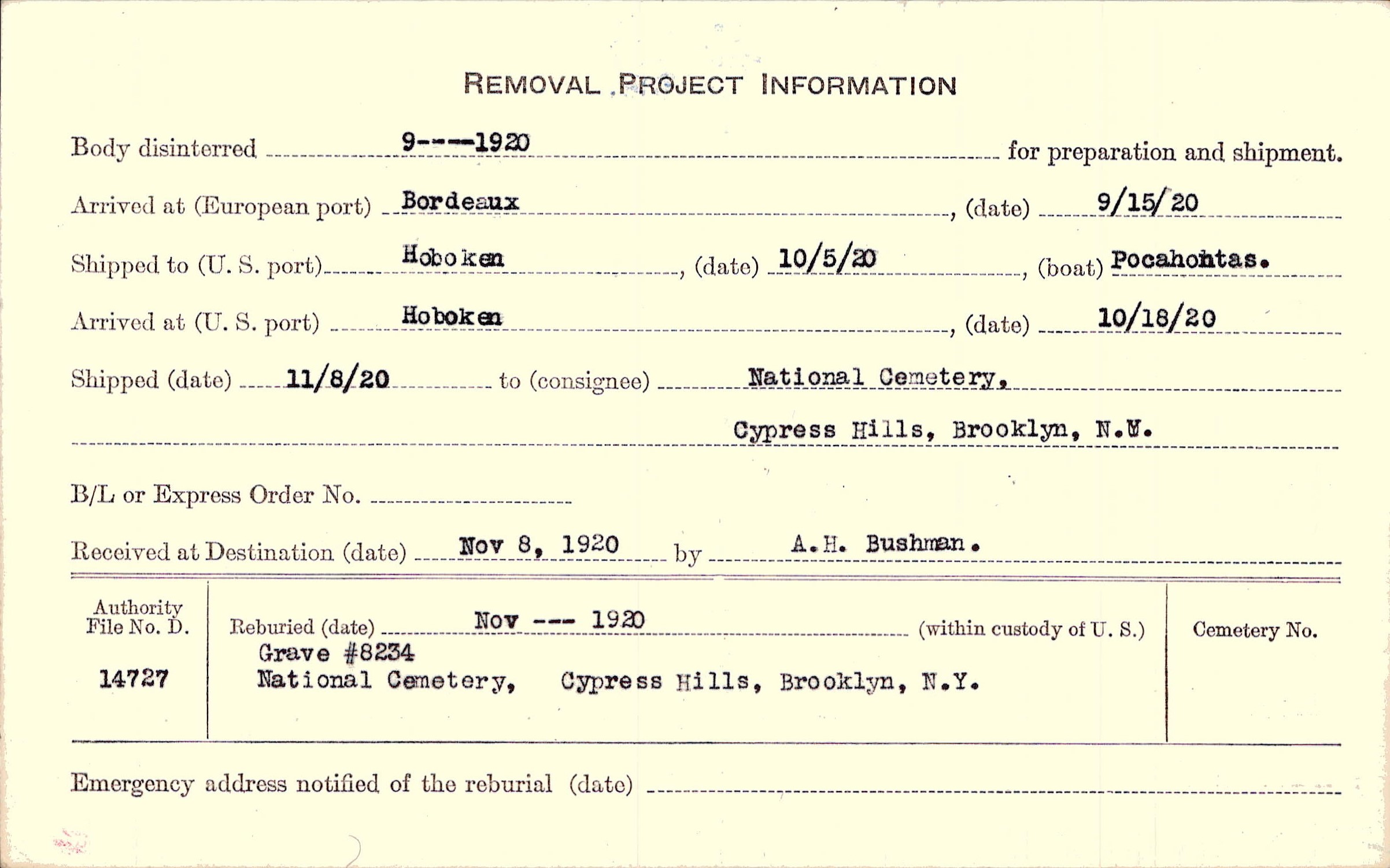 Body disinterred 9/1/1920 for preparation and shipment.
