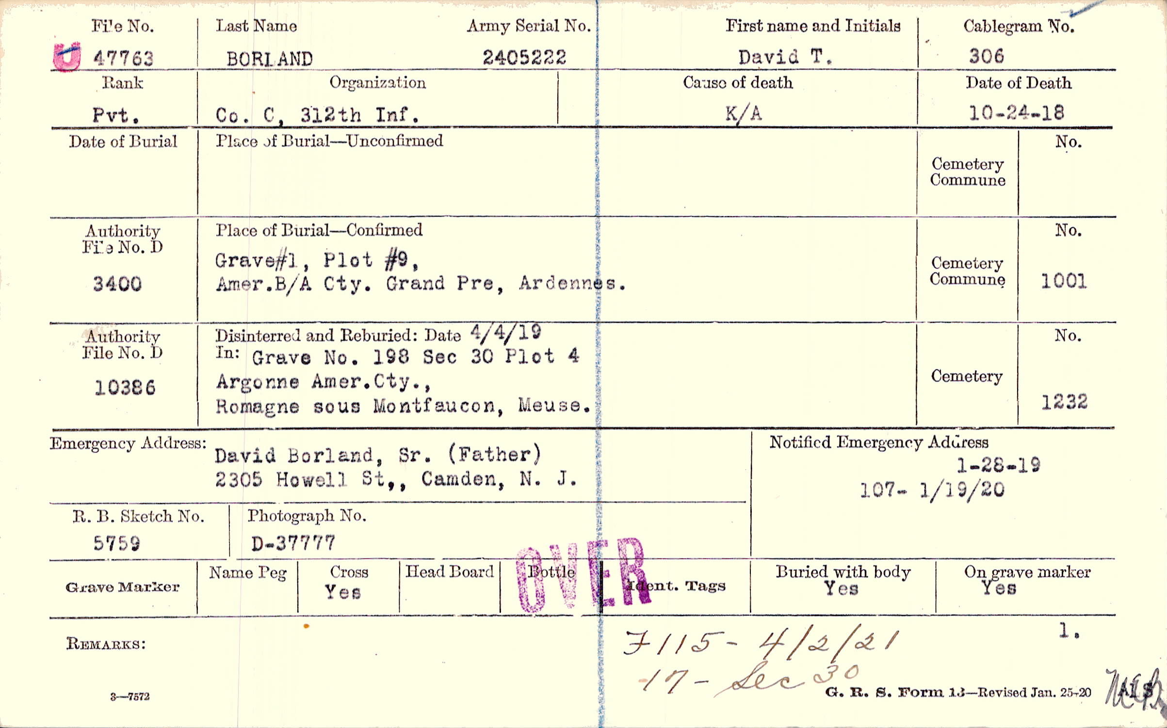 David Borland, Sr. (Father), 2305 Howell St,, Camden, N. J.