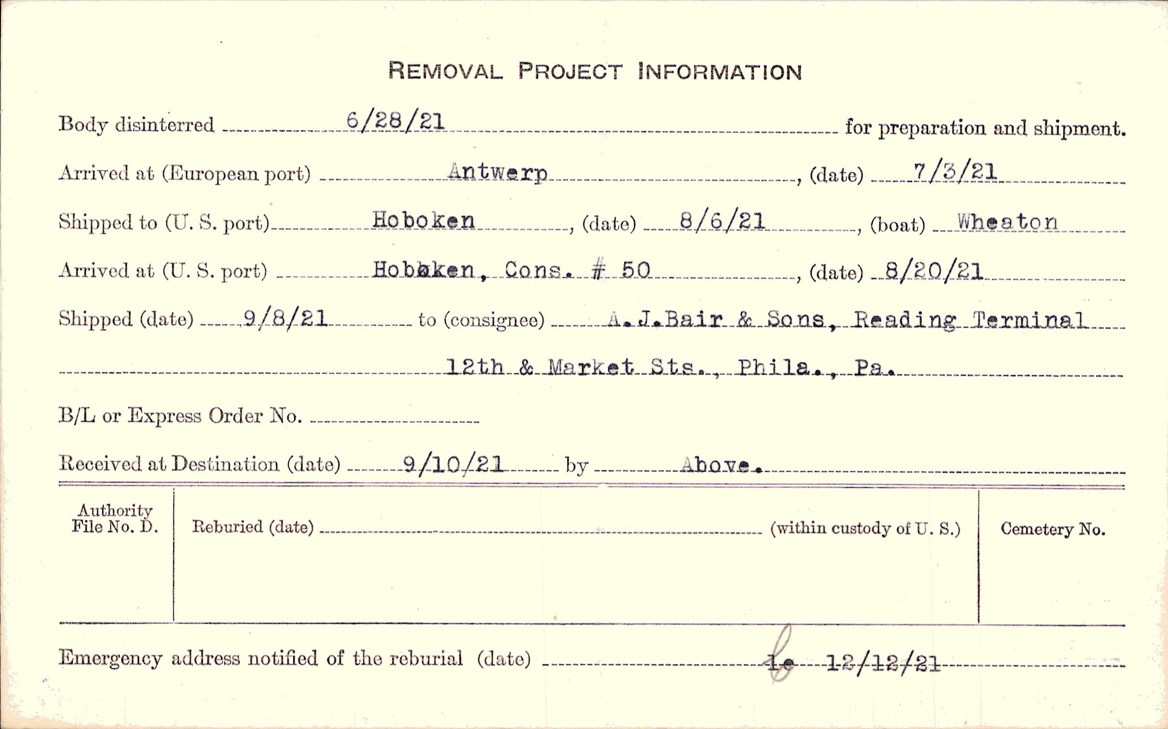 Body disinterred 6/28/1921 for preparation and shipment.