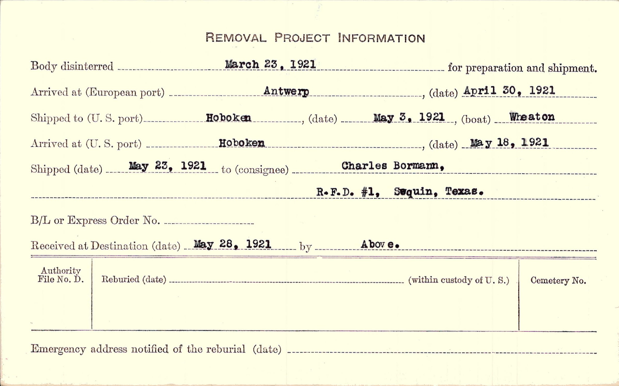 Body disinterred 3/23/1921 for preparation and shipment.