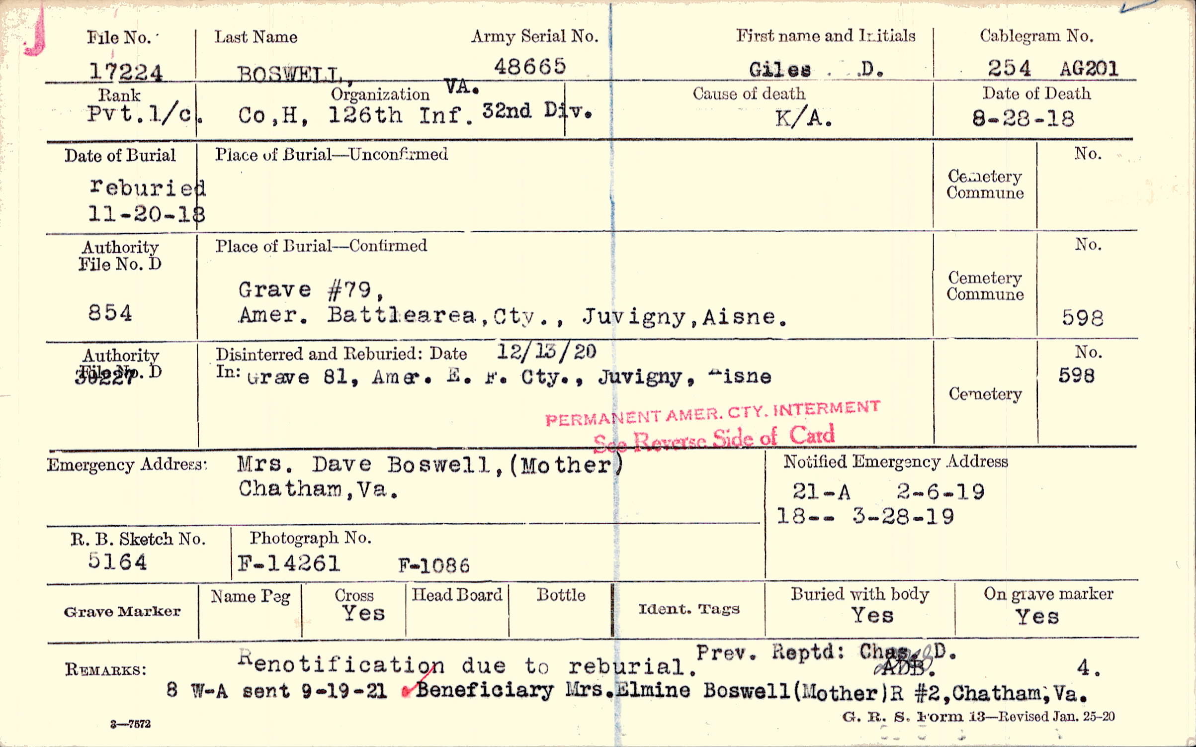Renotification due to reburial. Prev. Reptd: Chas D. ADB. Beneficiary Mrs. Elmine Boswell (Mother) R #2, Chatham, Va., 8 W-A sent 9-19-21 Beneficiary Mrs. Elmine Boswell (Mother) R #2, Chatham, Va.