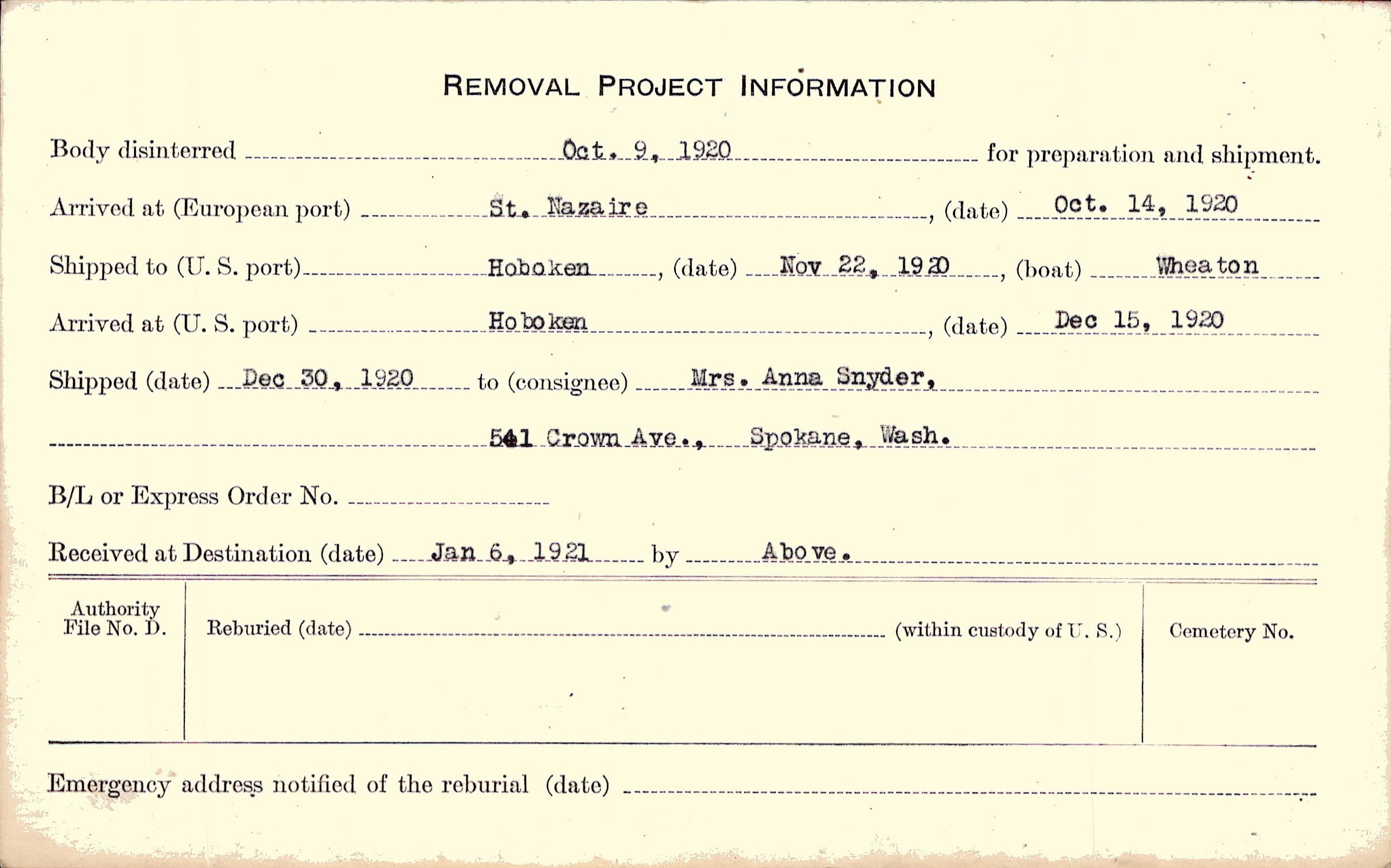 Mrs. Anna Snyder, (Mother), 5117 N. Crestline St., Spokane,Wash.
