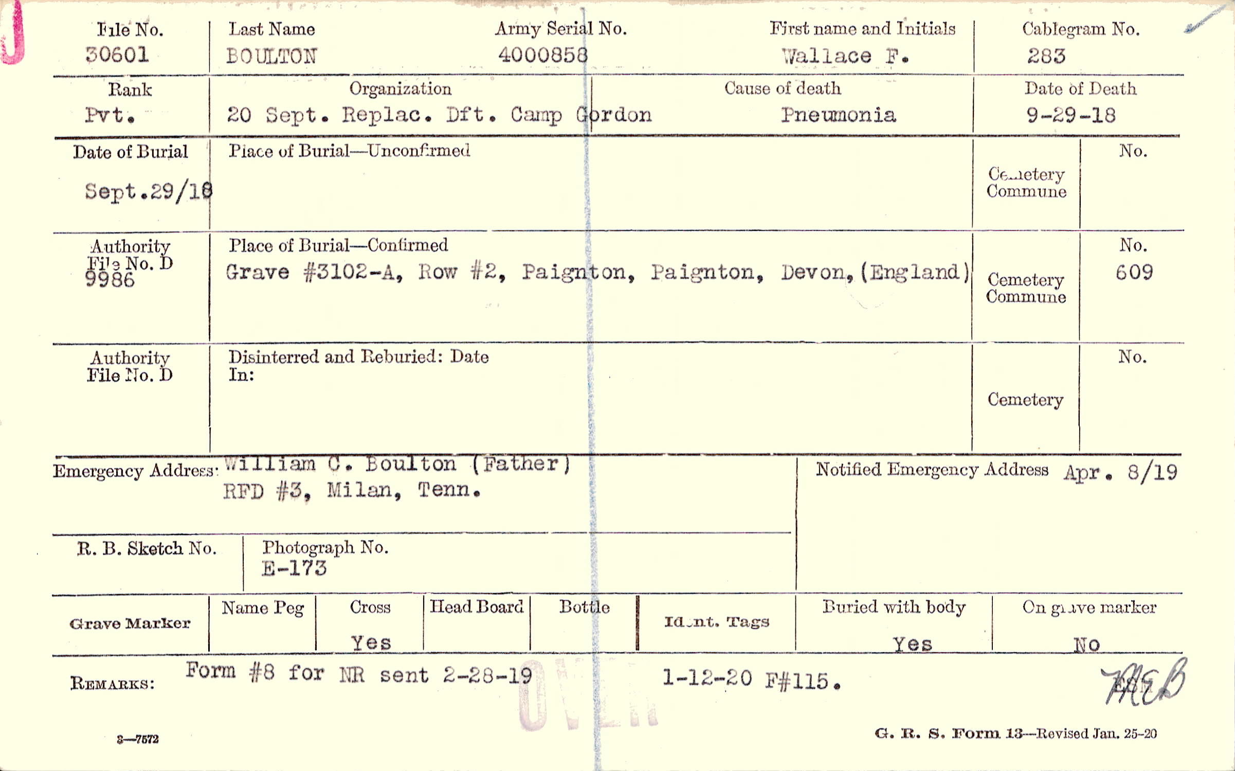William C. Boulton (Father), RFD #3, Milan, Tenn.