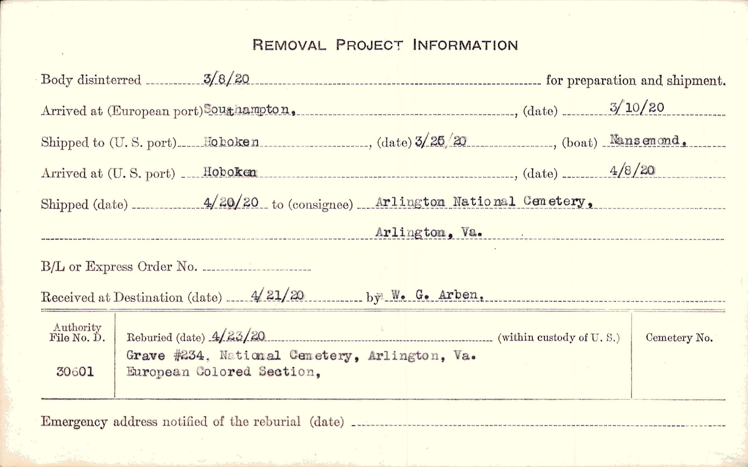 Body disinterred 3/8/1920 for preparation and shipment.