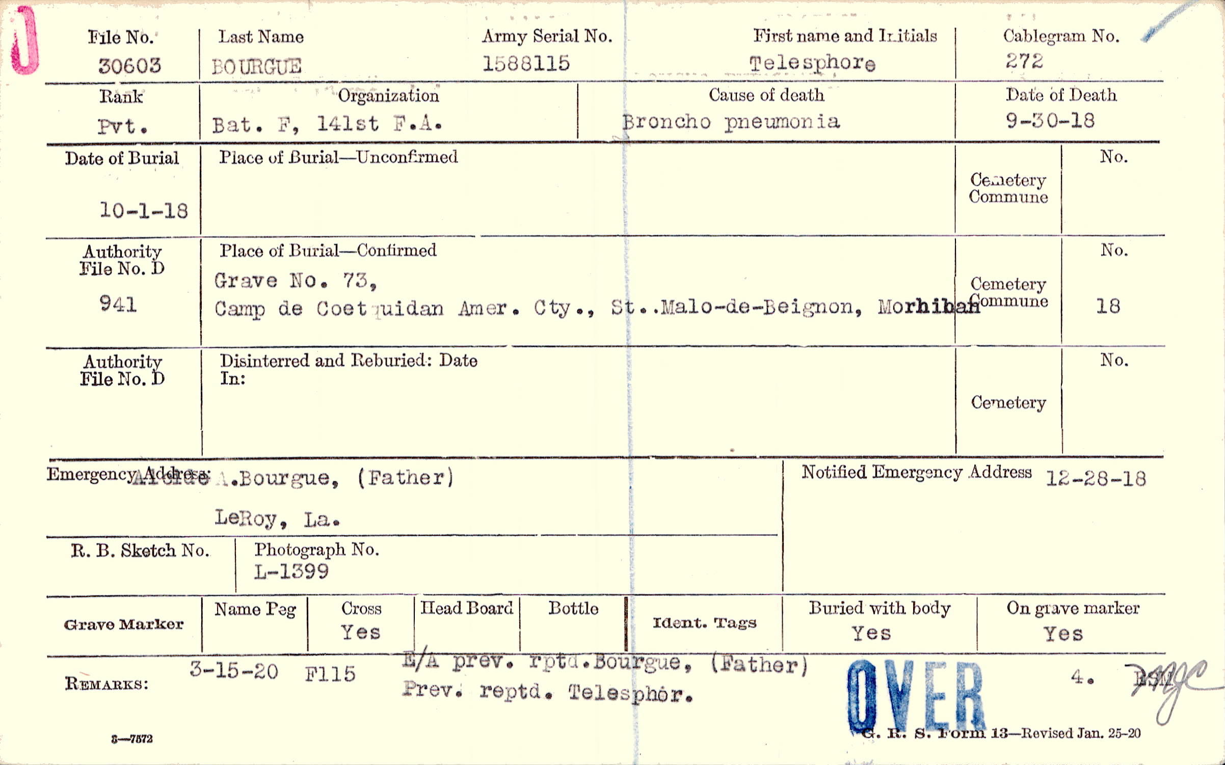 E/A prev. rptd. Bourgue, (Father) Prev. reptd. Telesphor., 3-15-20 F115