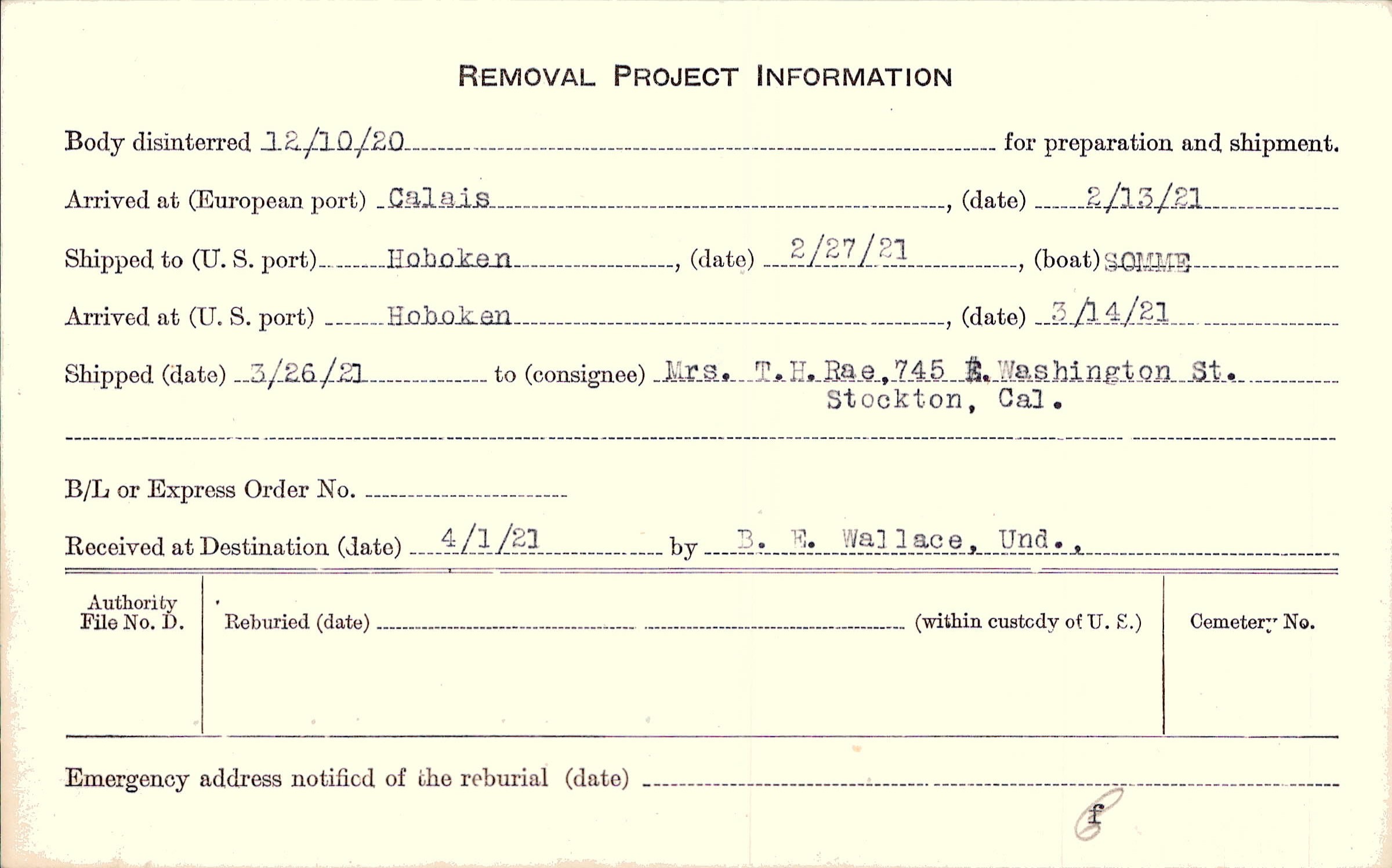 Mrs. T.H. Rae, Mother,, P.O. Box. 24, Farmington, Calif.