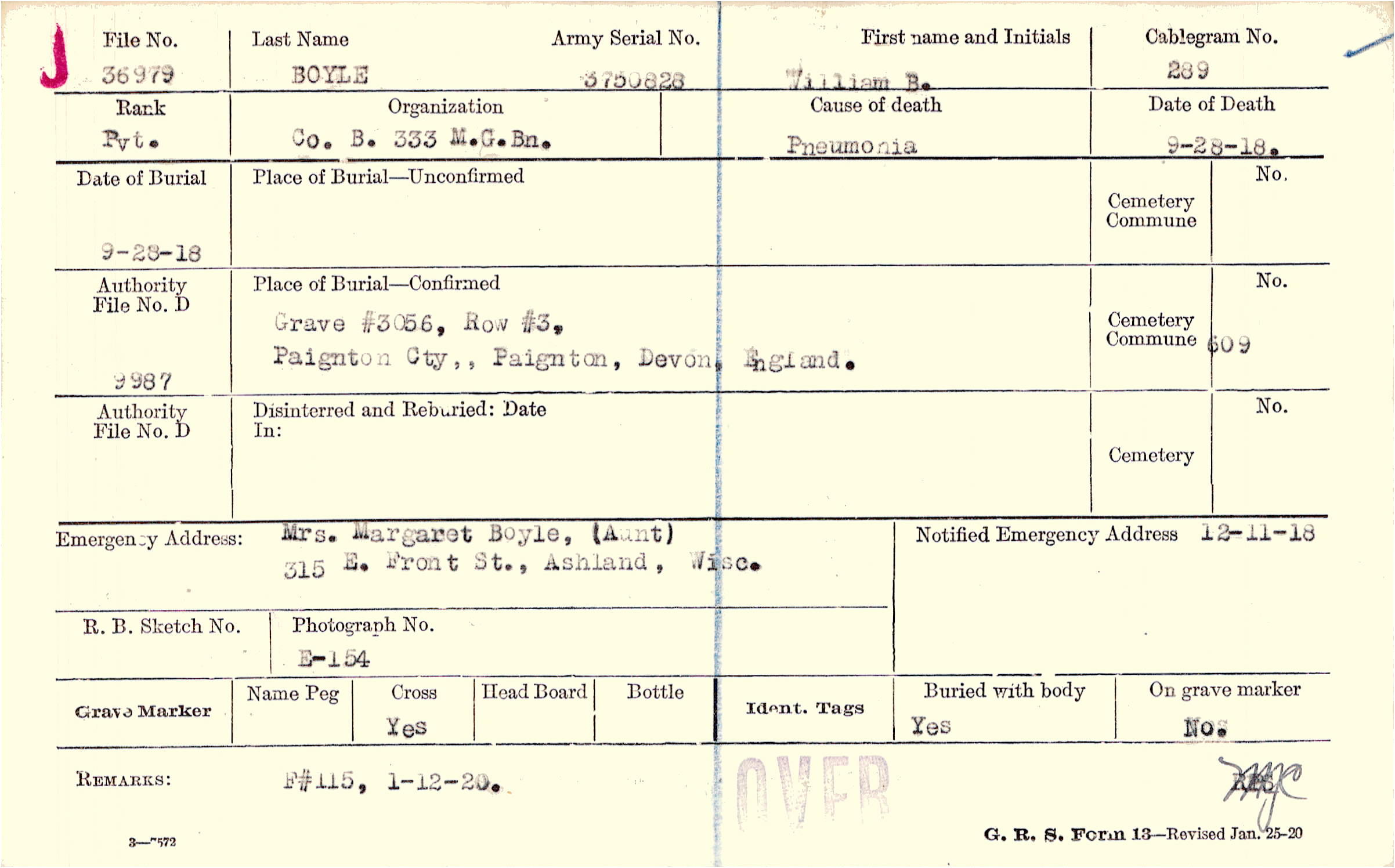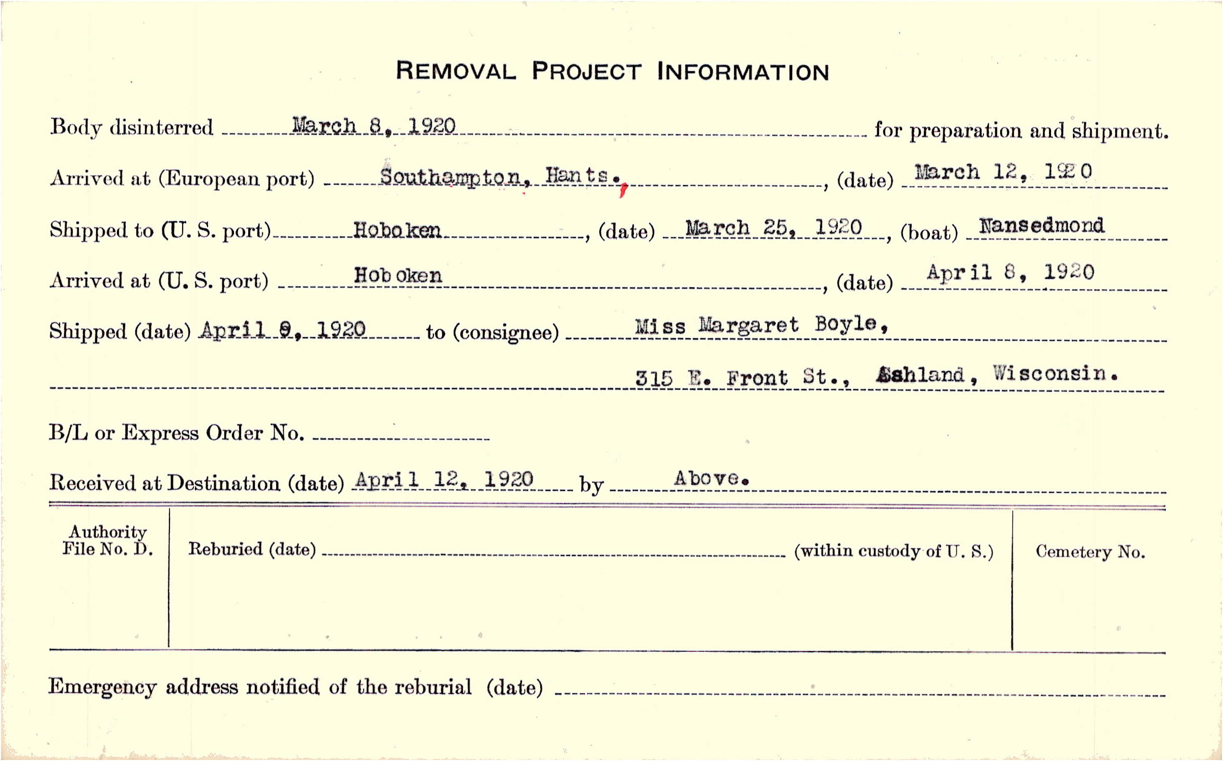 Mrs. Margaret Boyle, (Aunt), 315 E. Front St., Ashland, Wisc.
