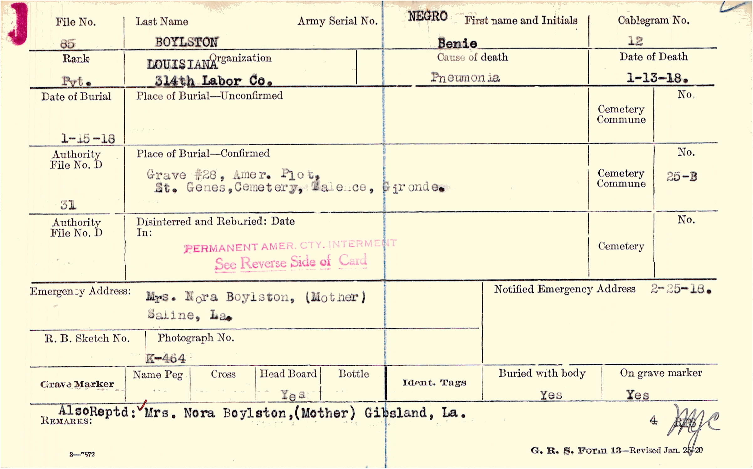 Also Reptd: Mrs. Nora Boylston, (Mother) Gibsland, La.