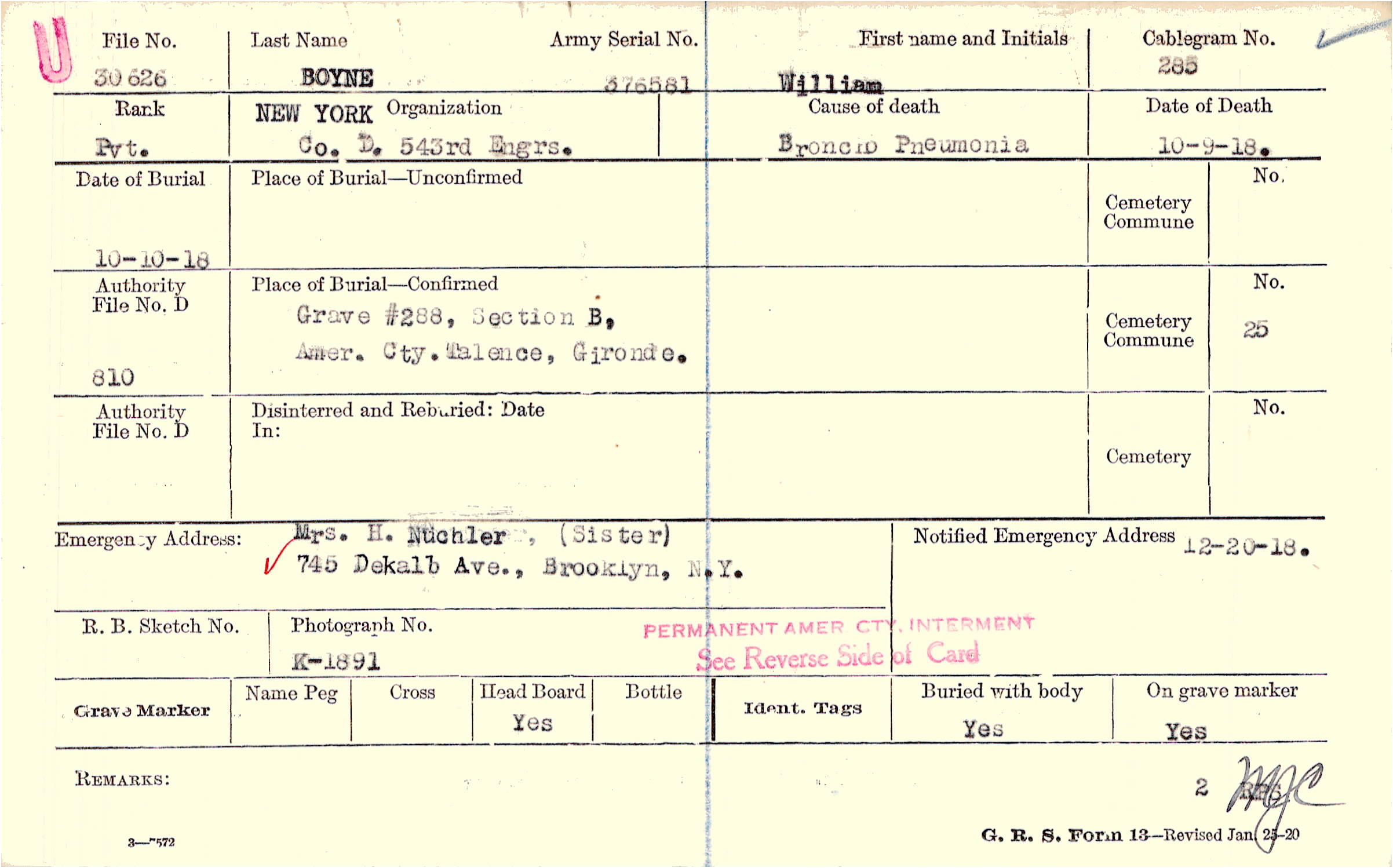 Mrs. H. Nuchler, (Sister), 745 Dekalb Ave., Brooklyn, N.Y., Permanent Amer. Cty. Interment See Reverse Side of Card