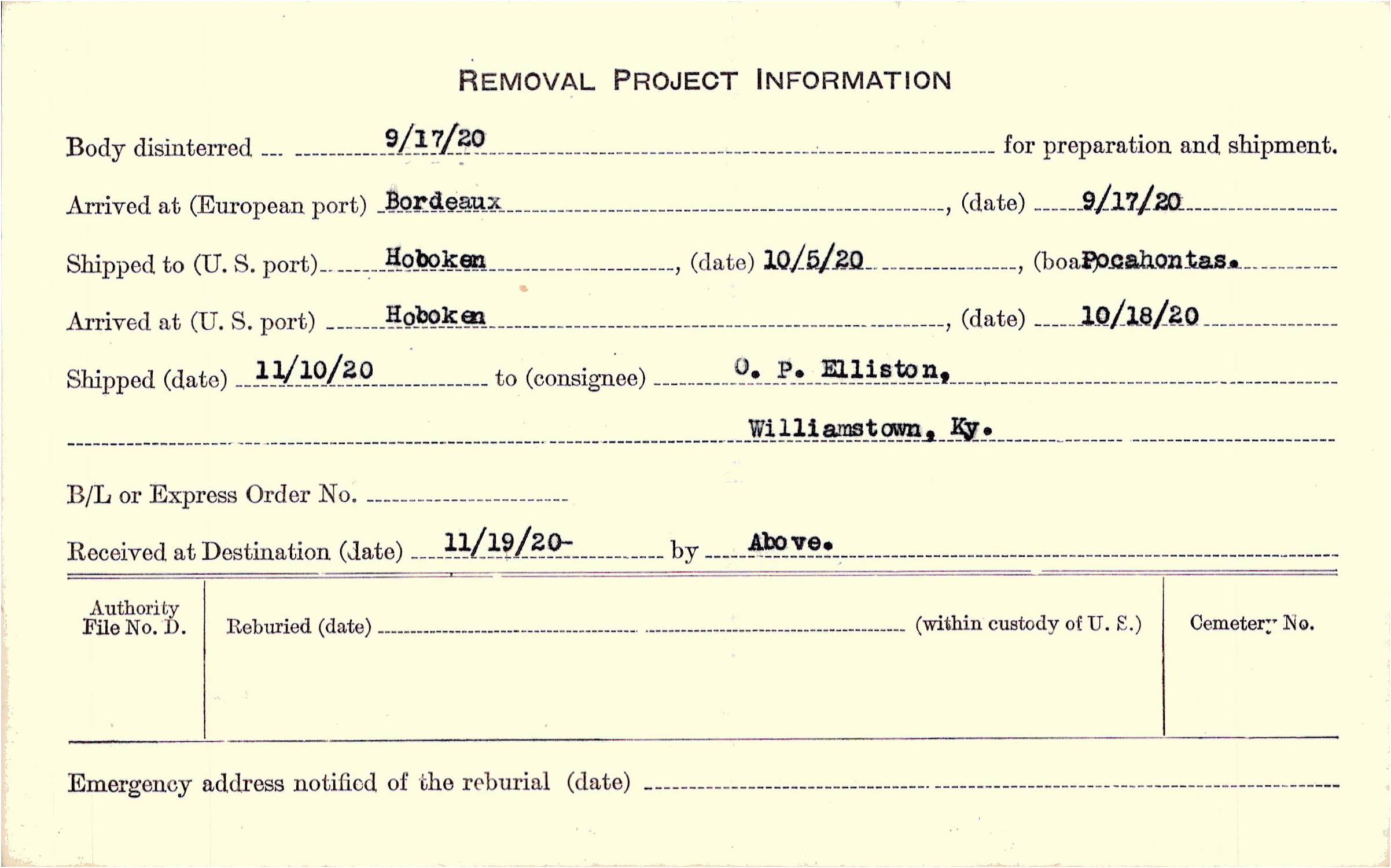 Body disinterred 9/17/1920 for preparation and shipment.