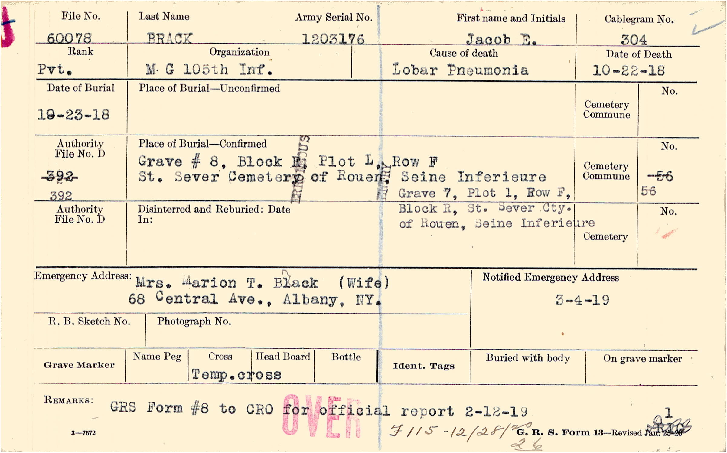 Mrs. Marion T. Brack (Wife), 68 Central Ave., Albany N. Y.