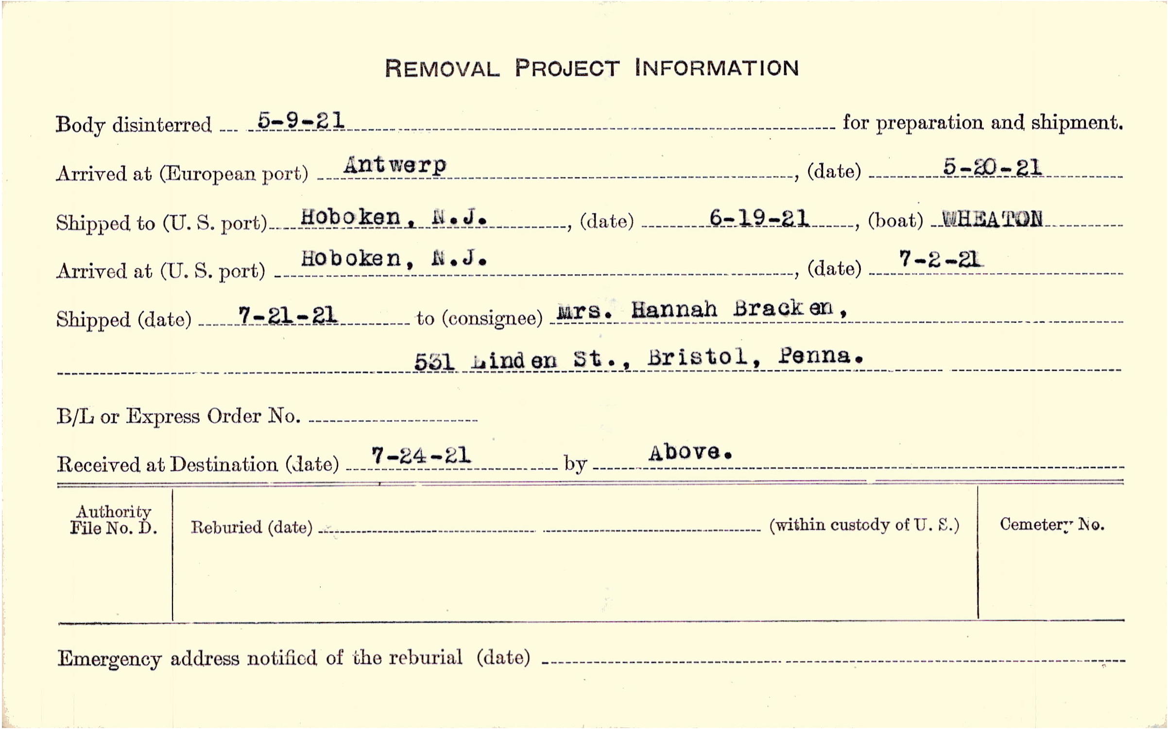 to Mrs. Hannah Bracken, 531 Linden St., Bristol, Penna.